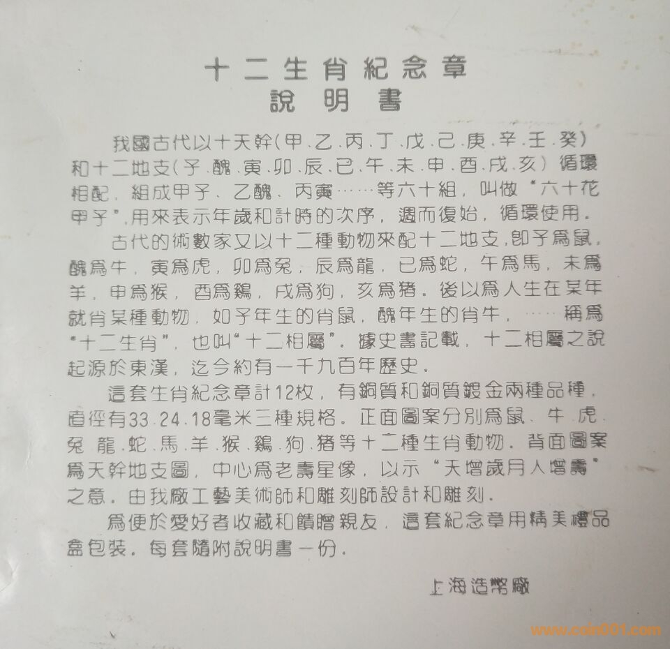 上海版生肖紀(jì)念幣一套