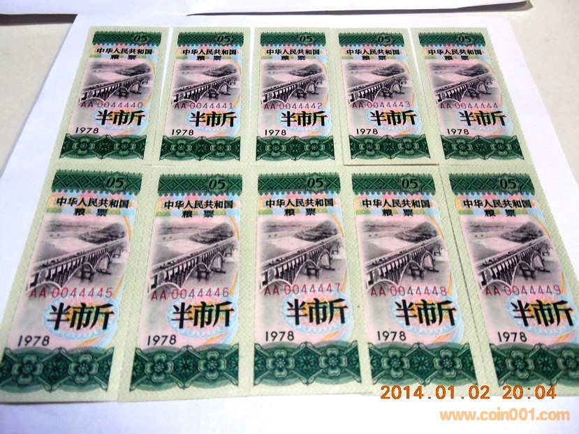 目前1978年中華人民共和國糧票實票整刀已經(jīng)的非常少見,最為難得的是半斤有5個4,品相非常不錯尾號3同號