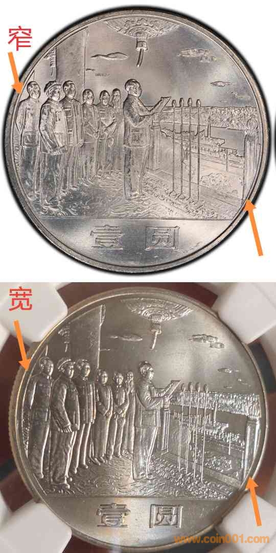 2、歡慶。不同于普通上海版歡慶,封裝華表為正面寬距右缺旗版,特點(diǎn)為正面人民大會(huì)堂圖案邊緣距離幣邊距離很寬且最右邊樓頂缺一面旗。