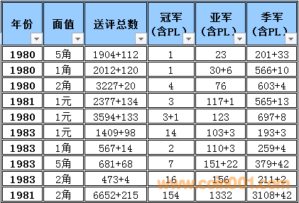 備注:關(guān)于這個(gè)數(shù)據(jù)的準(zhǔn)確性在設(shè)計(jì)這個(gè)表的時(shí)候我已經(jīng)考慮到了一個(gè)重評(píng)的可能性所以我只取冠,亞,季軍作為一個(gè)參考并同時(shí)設(shè)計(jì)了一個(gè)補(bǔ)償方案,重評(píng)從時(shí)間和金錢的角度來衡量的話不是非常經(jīng)濟(jì)且還存在一定的風(fēng)險(xiǎn),但是從長(zhǎng)遠(yuǎn)看不能排除這個(gè)因數(shù)。雖然將來會(huì)產(chǎn)生一些誤差,但我認(rèn)為誤差不會(huì)太大尤其在高分段和稀缺性的錢幣,對(duì)于普制長(zhǎng)城幣來說NGC已經(jīng)作為收藏的主流其數(shù)據(jù)的準(zhǔn)確性還是比較值得信賴的。