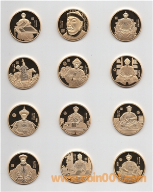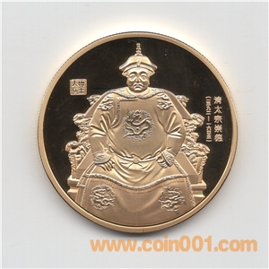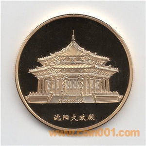 紀(jì)念章正面分別為清朝十二位帝王正面像,配以文字,生成年月及印章。背面為沈陽故宮中的標(biāo)志性建筑“大政殿”。