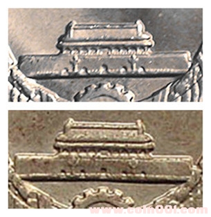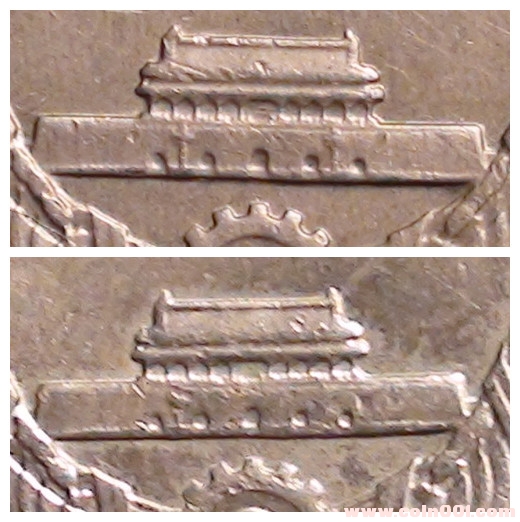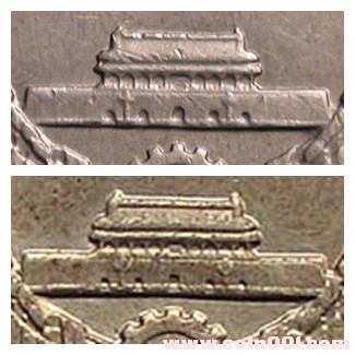 引用 引用第49樓馬良于2012-04-22 21:51發(fā)表的 : [upload=1上兩枚看不懂的流通過(guò)的長(zhǎng)城幣一元。除了華表外,還有三處看不懂,一是天安門(mén)下面的半個(gè)齒輪,上圖的規(guī)則,下圖很不規(guī)則且大小不一。二是天安門(mén)的五個(gè)城門(mén)洞差異較大。俺也不知哪個(gè)圖是規(guī)則,哪個(gè)圖不規(guī)則。三是城上兩邊的幾個(gè)窗口。兩圖比較差異也較大,俺也不知怎么說(shuō),只是覺(jué)得不一樣。上圖的窗框用俺的話說(shuō)比較直,下圖有些斜。特別是右邊的那幾個(gè)。是怎么造成的不懂,是模具問(wèn)題???是磨損問(wèn)題??還是其他的問(wèn)題???望指教。