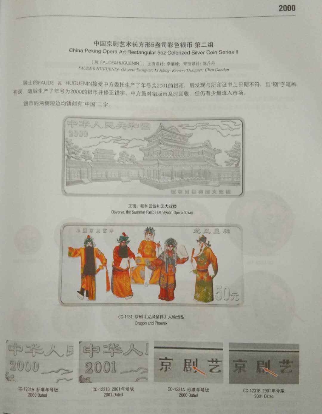 錯(cuò)版龍鳳呈祥京劇藝術(shù)五盎司銀幣為瑞士造幣廠鑄造,2001年投放京滬市場,證書號為2000---3000.幣中京劇的劇字少一豎,且年號與證書也不相符,這屬于鑄造重大失誤,錯(cuò)幣無疑。