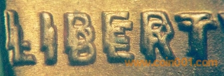此處的重影出現(xiàn)在 1972 年林肯分幣重模版別上。請(qǐng)注意在GOD一字中,重復(fù)的圖案是凸出而圓滑的,和正常字母一樣。