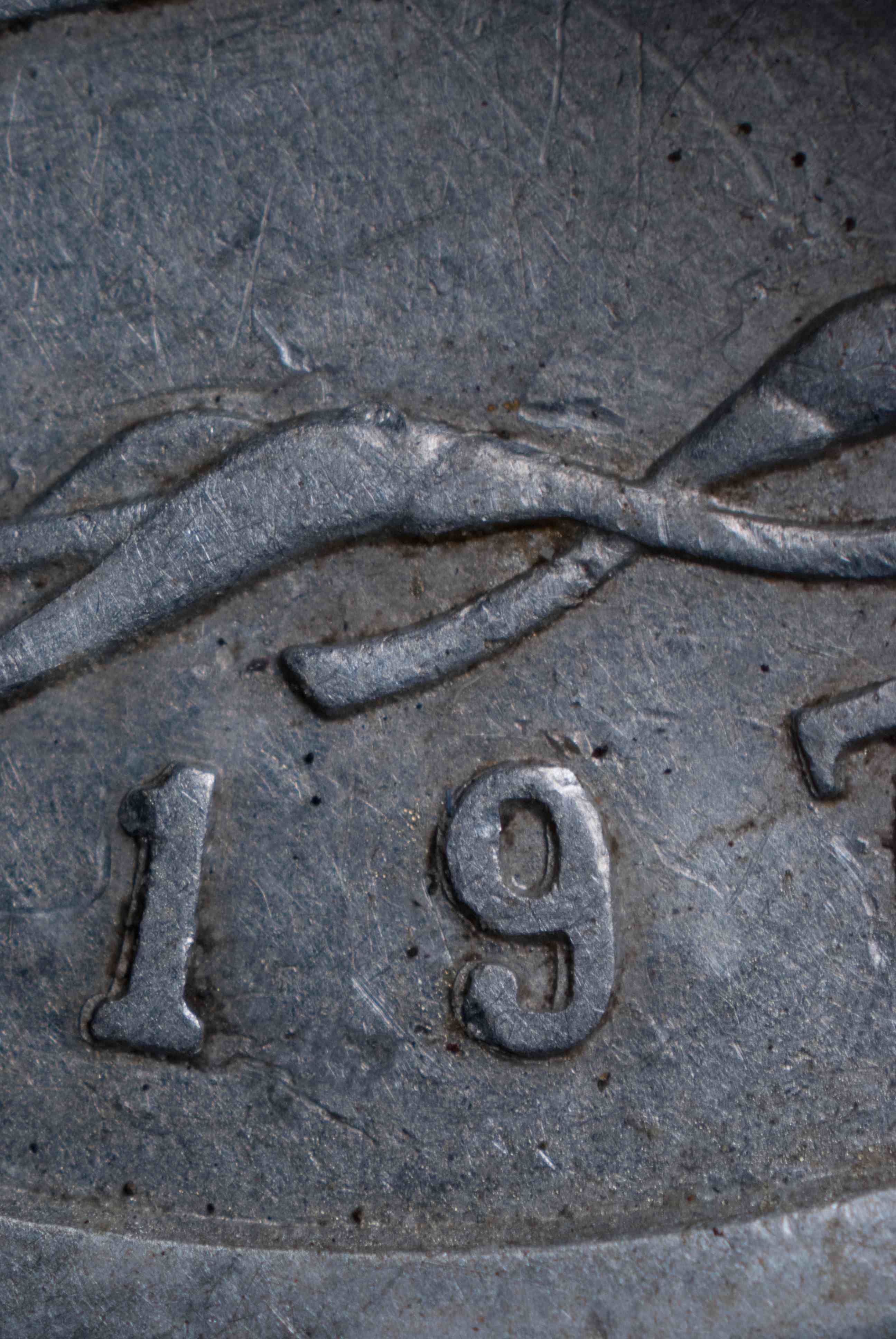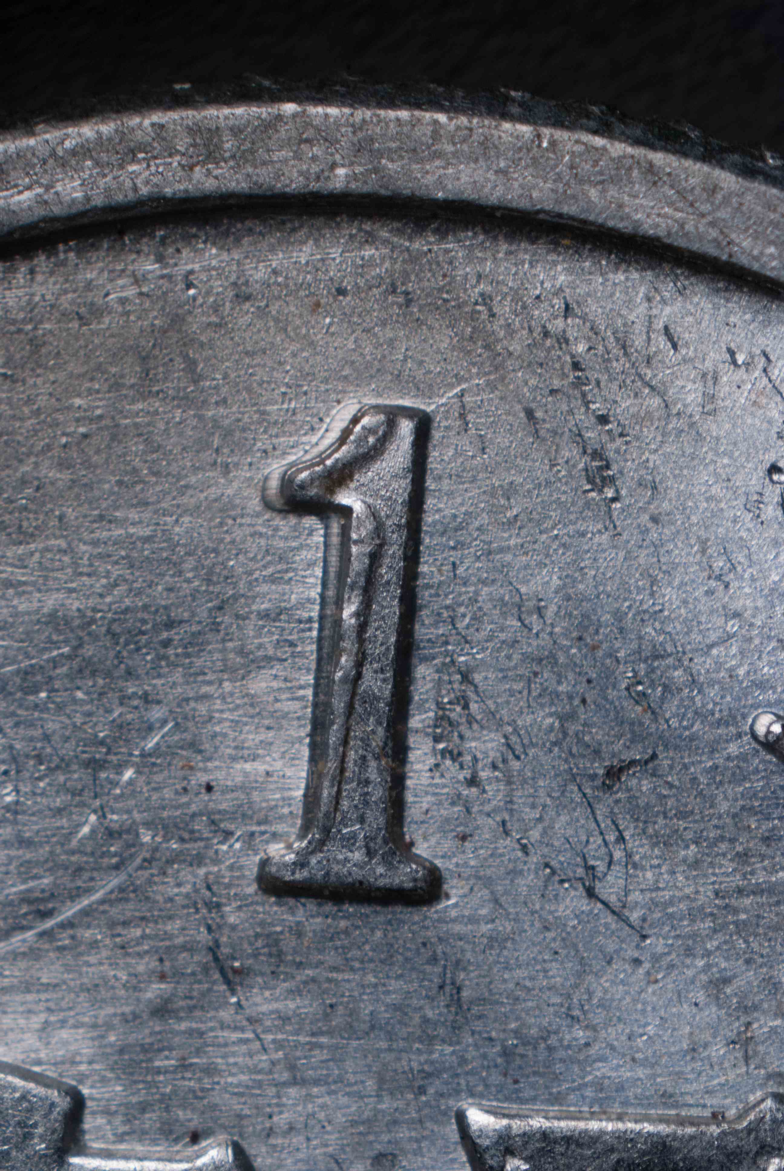 左邊這枚是壓印林肯分幣背面的工作模,已經(jīng)翻模完畢的外觀。請(qǐng)注意,其上面圖案和壓印出來(lái)的幣是相反的。雖然照片上難以看清,但是圖案在工作模上是凹陷的(陰紋)。箭頭所指之處是幣邊周圍的凸出部,它們和二元模上的凹槽相對(duì)正。工作模右邊還有一些鋼棒模坯,可用來(lái)制作陰紋原模、二元?;蚬ぷ髂?。美國(guó)造幣局于 1969 年更改了林肯分幣正面的圖案。但是在做出這些更改以后,在工作模上壓出滿意的圖案就非常困難。為了解決這個(gè)問(wèn)題,造幣局去掉了陰模和陽(yáng)模上的凹凸槽,以便讓陽(yáng)模更加深入地壓入陰模。但這樣一來(lái),又可能造成重模問(wèn)題。