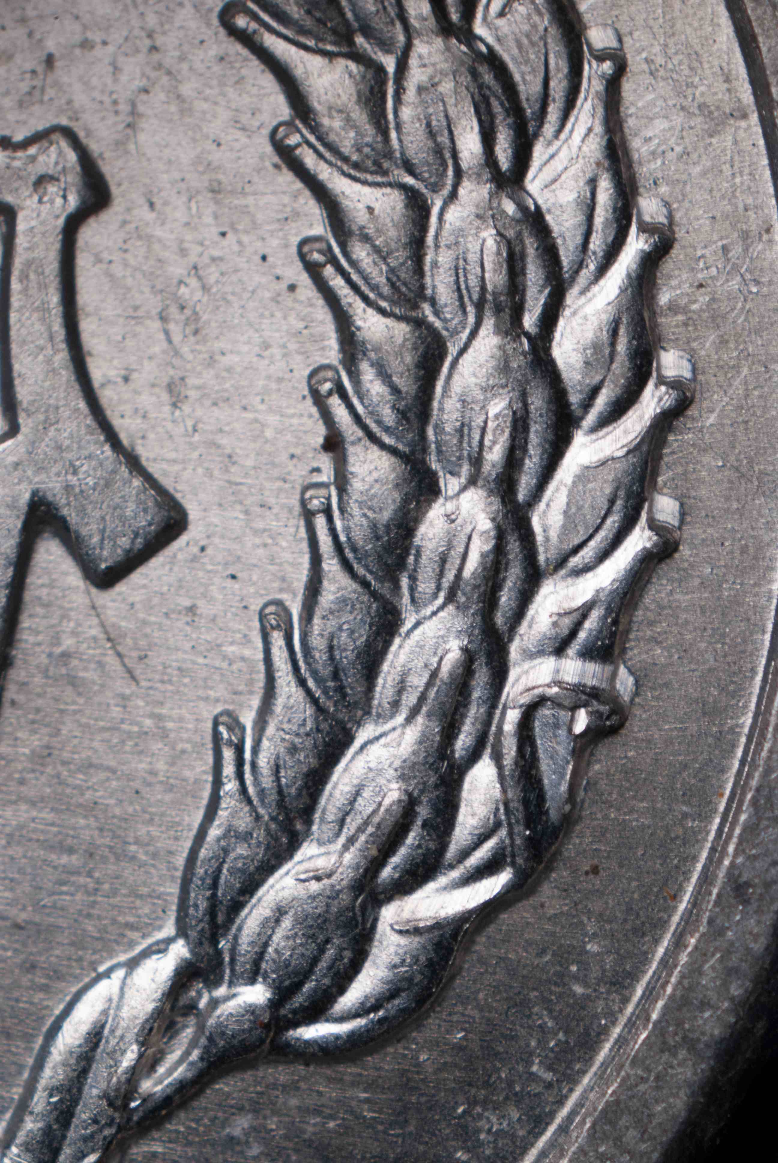 這幅照片顯示了用于壓印林肯分幣背面的二元模。如果您仔細(xì)觀察,就會(huì)發(fā)現(xiàn)二元模表面的圖案是陽(yáng)紋,和壓印完成的錢幣上的圖案一樣。箭頭所指之處是二元模邊緣的凹槽。如果要多次翻模,工作模上的凸起部分將嵌入這些凹槽,保證二元模和工作模精確對(duì)正,在制作的陽(yáng)模或陰模上做出滿意的圖案。