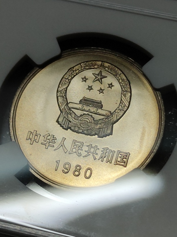 但問題來了,我們看到的長城幣國徽拉絲特別明顯,這也是拋光紋嗎?個(gè)人答案也是肯定的,同樣是拋光紋造成的拉絲效果,只是長城幣國徽的模具拋光紋造就拉絲是有意而為之。原因就是早期國內(nèi)的精制幣還在研發(fā)當(dāng)中,對于國徽噴砂的工藝還有難度。為了突出國徽的形象,在模具上造成較深和密集的同向拋光紋,壓制出來的幣通過光的反射形成明顯的拉絲效果,這大概可以說是當(dāng)時(shí)的一種“假噴砂”的做法吧。最早是運(yùn)用在了80冊上,后來在81年的幣品里面依然能看到,但83,85的這種手法就基本難看到了。