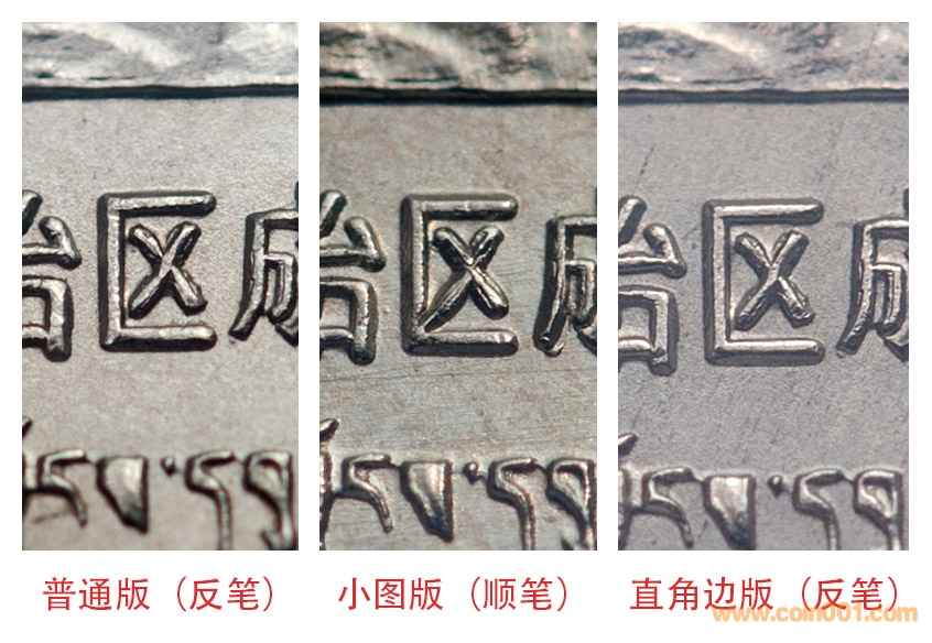2、反筆“區(qū)”線條:普制樣幣版“區(qū)”——普制(初打)幣版“區(qū)”——直角邊版“區(qū)”——高精禮品幣版“區(qū)”;