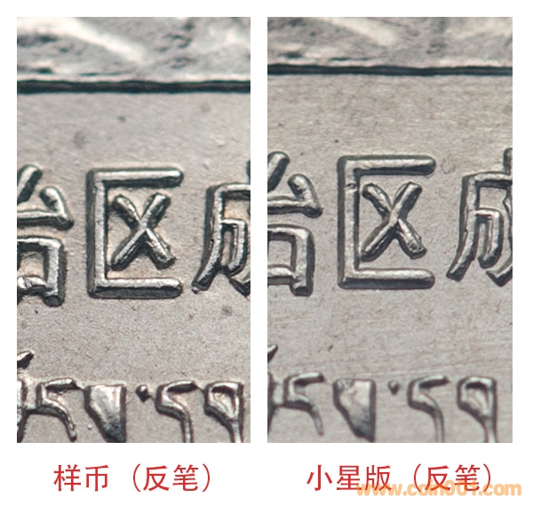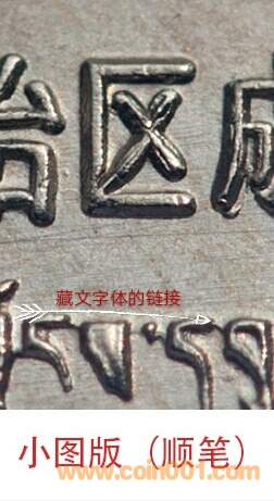 您提出的“成”字。確實也存在著筆劃書寫順序的先后。尤其“成”字上面的那一“橫”與“折勾”的先后。據(jù)觀察幾乎所有老西藏的版別幣,“橫”都是壓著“折勾”的,是錯誤的筆劃書寫順序。不知道小圖版(遠(yuǎn)山)、非標(biāo)高精版及非標(biāo)普精版是不是正確的書寫順序?還是后期經(jīng)過修模改變了?