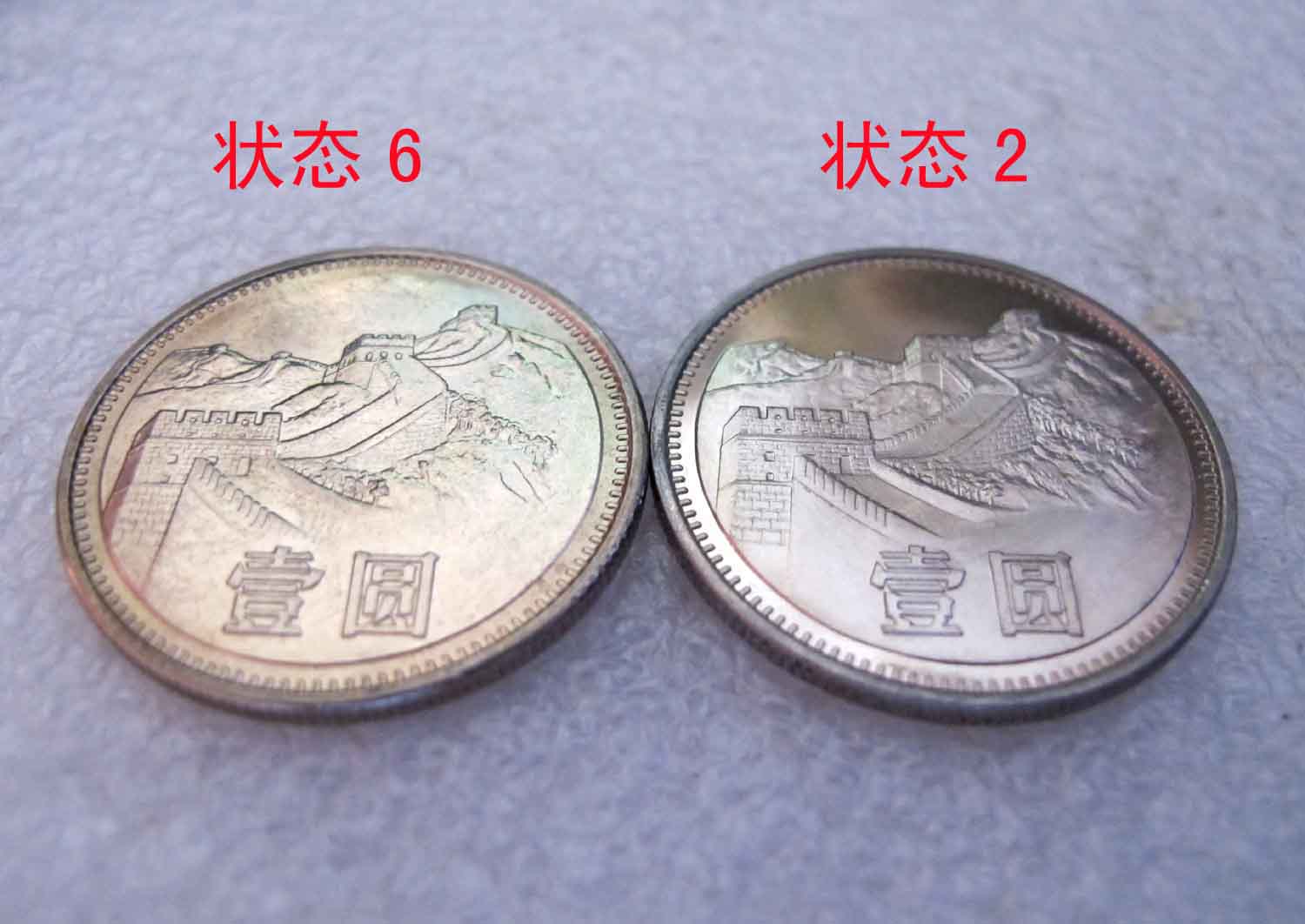 目前,81年壹圓長城幣的六種狀態(tài),是現(xiàn)有實物外觀的真實反映。至于怎樣區(qū)分各狀態(tài)的優(yōu)劣,一個人一個眼光,只能由泉友自己評判。六種狀態(tài)的81年壹圓長城幣,實質為精制幣、普制幣兩大類。而每一大類幣的外在狀態(tài)也不同。通過認真對比發(fā)現(xiàn):狀態(tài)1和狀態(tài)2兩種精制幣,其外觀狀態(tài)并不完全相同。共同點是:1、模具手刻,字體、圖案層次感強;2、凸部噴砂處理;3、凹部鏡面(國徽除外)。不同點是:狀態(tài)1的凹部光潔度高,鏡面感強;而狀態(tài)2的凹部光潔度較低,鏡面感弱,總體感覺狀態(tài)2的質量較狀態(tài)1差一些,似乎與狀態(tài)1不在一個檔次(非存放狀態(tài)所致)。從目前市場反映的情況來看,狀態(tài)6多于狀態(tài)3、狀態(tài)4、狀態(tài)5。而狀態(tài)3、狀態(tài)4、狀態(tài)5三者的珍稀度排序,實在難以評論!在這里可以告訴大家一個真實的情況:狀態(tài)3的生產時間早于狀態(tài)4,且存在兩種狀態(tài)混裝現(xiàn)象(早期狀態(tài)3卷裝中含有少量狀態(tài)4,后期狀態(tài)4含有少量狀態(tài)3),狀態(tài)5的盒裝封簽是83年,無混裝現(xiàn)象。