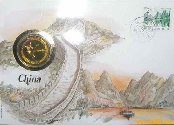 一套1枚,貼普21祖國風光普通郵票(雕刻版)之2元桂林山水郵票1枚,內(nèi)嵌幣為“1982年足球1元銅幣”1枚。發(fā)行日期:1994年5月3日,發(fā)行數(shù)量:不詳。有專門的說明書,介紹中國地理位置,所用的文字,首都,傳統(tǒng)文化等等。背面空白。