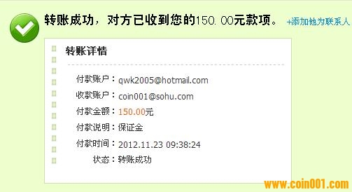 引用 引用第84樓樂其中于2012-11-23 19:59發(fā)表的 : 拍賣保證金 交易號(hào) 2012112300001000070016511360 商戶訂單號(hào) 1353623848985120040 ?????? 200.00 分類:付款???? .......