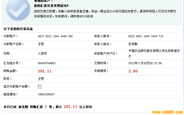 引用 引用第117樓華陽歐義于2012-12-04 13:01發(fā)表的 : 轉(zhuǎn)賬結(jié)果轉(zhuǎn)賬交易成功 交易時間:2012年12月04日 12:59:54 網(wǎng)銀流水號:02012120412597542409 付款方 賬號 622846002000XXXXXX12 收款方 賬號 6228490010015268714 戶名 歐義 戶名 孫克勤 開戶行 天津分行 開戶行 北京分行 賬戶性質(zhì) 借記卡 賬戶性質(zhì) 借記卡 .......