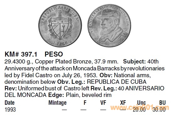 ?? 古巴革命領(lǐng)袖菲德?tīng)枴たㄋ固亓_1993年1比索銅幣(38mm)100/枚包郵。直徑:37.9mm