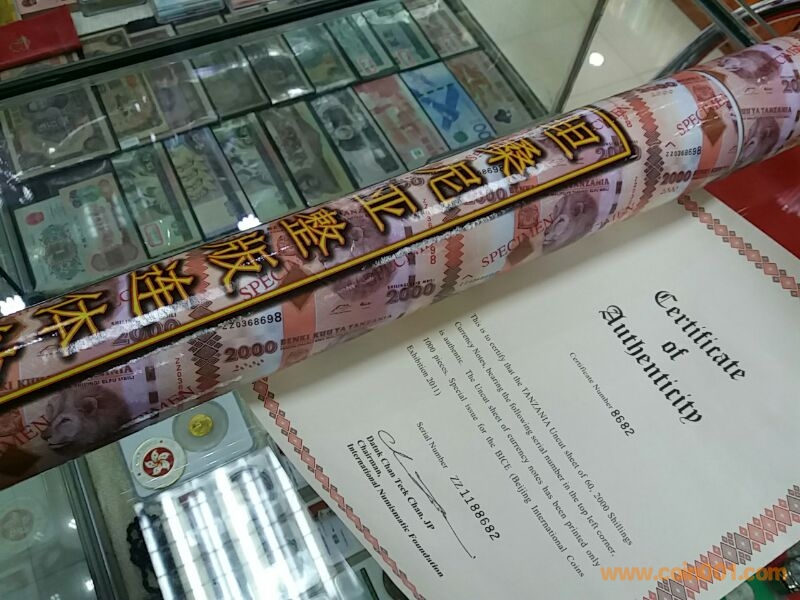 超低價6800元售好號60連體坦桑尼亞整版連體鈔。連體鈔由坦桑尼亞銀行權(quán)威發(fā)行,發(fā)行價為29800元,發(fā)行量1000套,2011年北京世界錢幣博覽會的特供展品,隨著現(xiàn)在連體鈔收藏價值的不斷在攀升,不管是收藏還是投資都具有著非常不錯的前景。 整版鈔收藏投資時,具有的三大優(yōu)勢。一:備受矚目的"樣票"整版鈔,坦桑尼亞政府為了保證此"超重量級"的藏品的至高地位,每張"鈔王"均有"SPECIMEN"(翻譯:樣票)字樣,這是目前世界上唯一 一套票幅最大的樣票整版鈔、同時每套"鈔王"均配有唯一編號的收藏證書,且證書編號與配套的整版鈔末四位數(shù)字完全匹配,保證每套整版鈔都是獨(dú)一無二的絕世珍品,為藏品增加了極高的"保真"附加值。樣票的特性比他做為錢幣流通更具有收藏價值。二:獨(dú)特的造幣技術(shù),坦桑尼亞整版鈔采用了滾動光變油墨技術(shù)和當(dāng)今世界最為先進(jìn)的防偽安全線,當(dāng)手持紙鈔左右晃動時,安全線內(nèi)的菱形圖案會發(fā)生垂直位移;當(dāng)手持紙鈔上下晃動時,安全線內(nèi)的菱形圖案則會發(fā)生水平位移 。是目前國際最高防偽級別的連體紀(jì)念鈔.,三:獨(dú)具亞歐非三洲屬性的珍稀整版鈔,濃厚的世界文化氣息,采用歐洲最先進(jìn)的印鈔技術(shù),由非洲坦桑尼亞共和國發(fā)行,最終為北京錢幣博覽會特供。