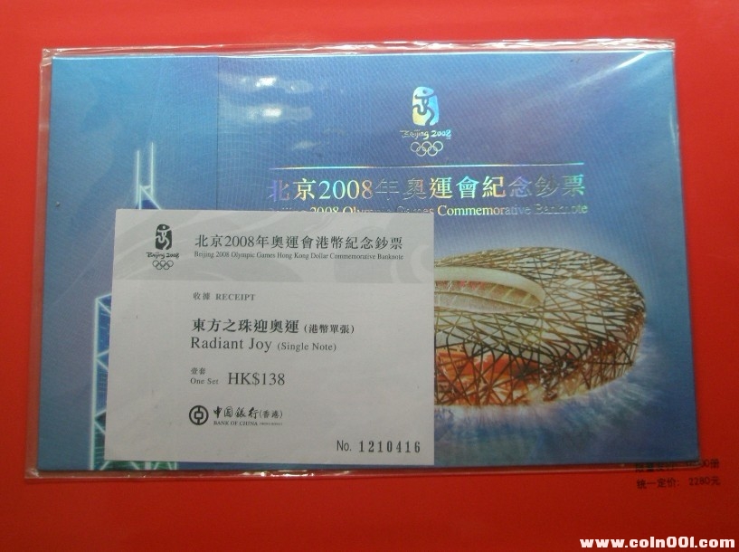備 注:澳門(mén)、香港中國(guó)銀行發(fā)行的奧運(yùn)鈔,當(dāng)年都是溢價(jià)發(fā)行的,發(fā)行價(jià)HK$138,香港有收據(jù),澳門(mén)沒(méi)有。鈔絕品,冊(cè)全品到絕品,膠套等該有的都有。