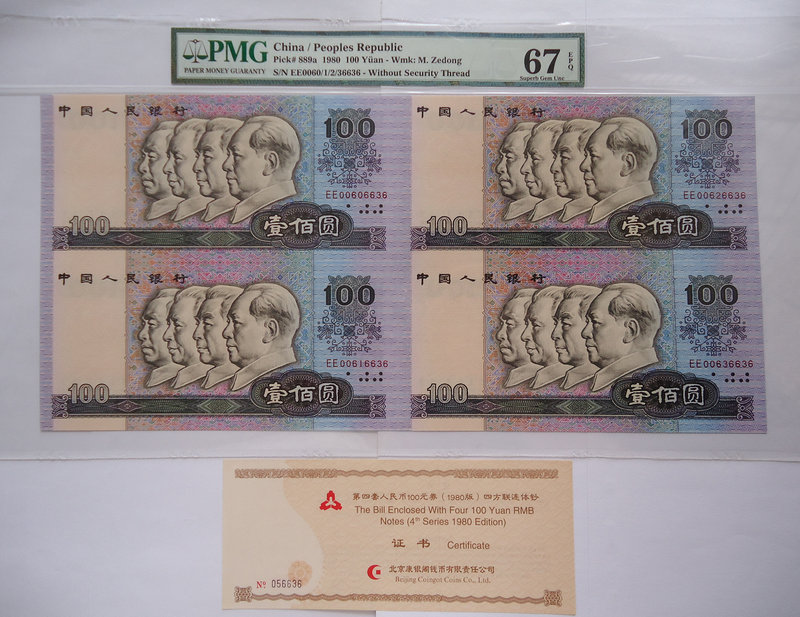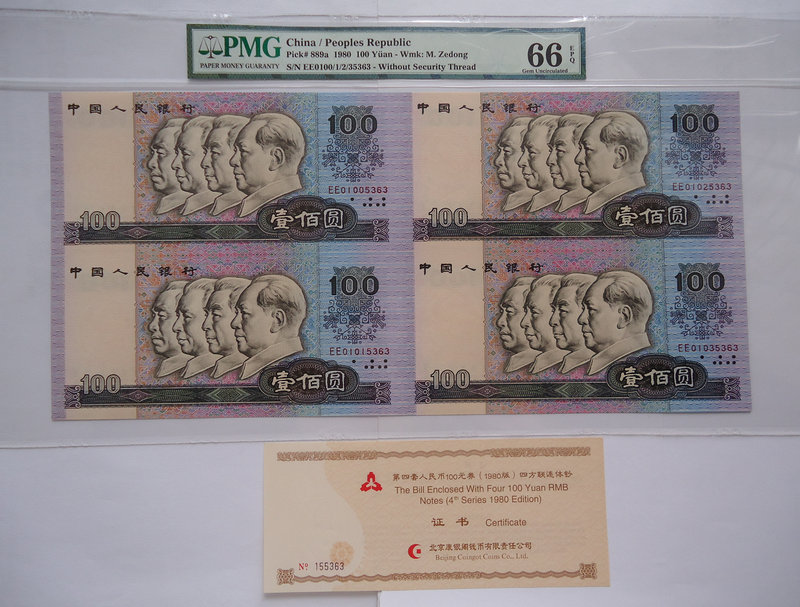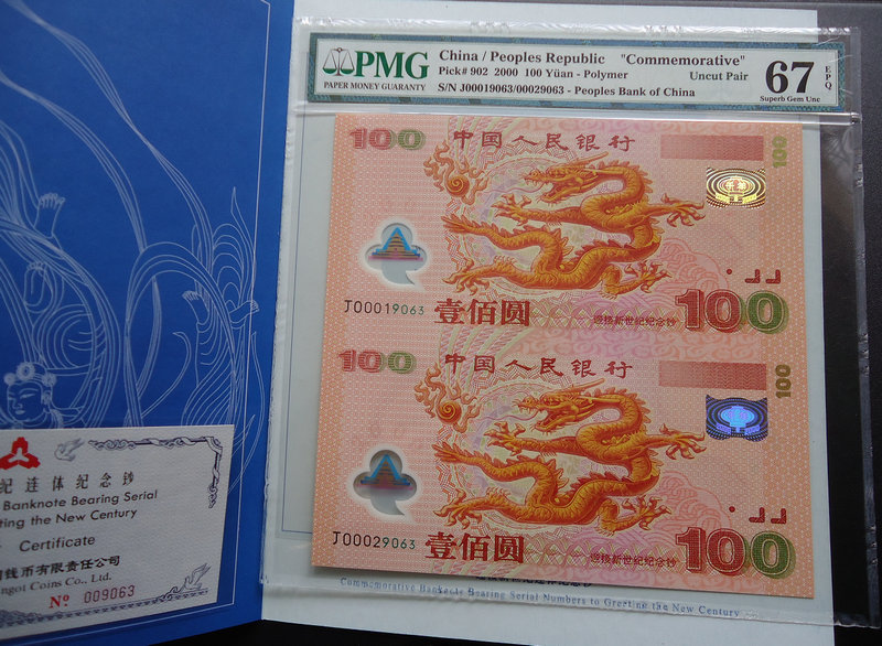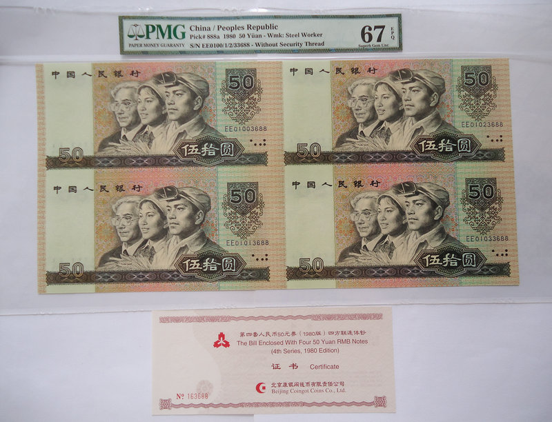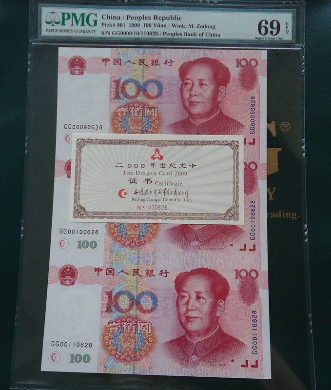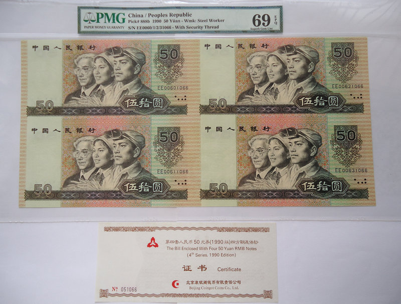 以前看不起9050的四連體 總感覺很便宜的貨 結(jié)果今天一看 證書 原是2000年的發(fā)行的 和朋友一交流才知道 9050四連體的牛號比8050的四連體的更難找!8050四連體是2006年印刷的 屬于連體鈔后期發(fā)行的!