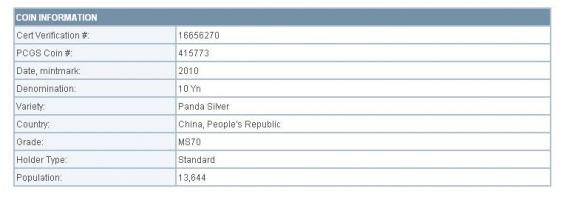 今天在某網(wǎng)站看到3枚NGC70的2011熊貓銀幣,看到還有標(biāo)簽,就順便查了下數(shù)據(jù)庫(kù),好家伙,評(píng)了829枚了,70分的230枚,一枚68分的,其余都是69分。