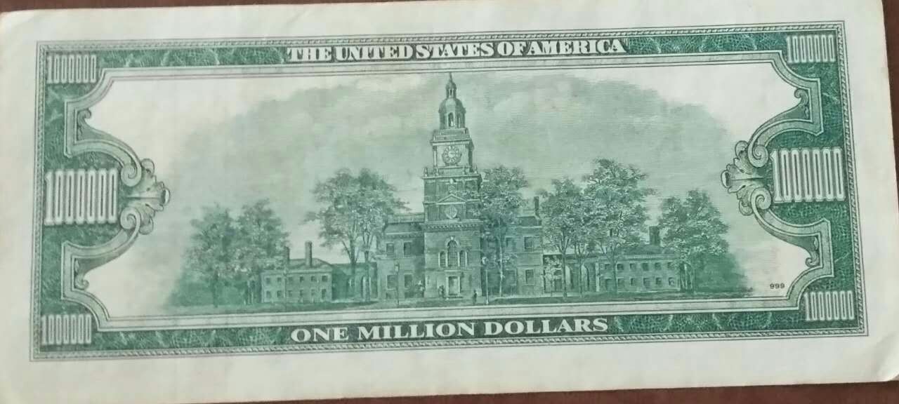 應(yīng)該是假的,美國歷史上發(fā)行的最大幣種(金幣券)面值為100000美元,而且是1934年發(fā)行的,正面為伍德羅·威爾遜(美國第28屆總統(tǒng)),而且面額為100000美元的紙幣從未投入流通,只是作為聯(lián)邦儲備銀行之間的結(jié)算券,1933年3月9日,美國總統(tǒng)羅斯福簽署總統(tǒng)令,終止了金幣券的流通,將其不論面額全部收回。至1940年,金幣券回收完畢。1946年以后美國不再發(fā)行新的大面額紙幣,至1969年,所有面額在100美元以上的大面額紙幣全部退出流通。