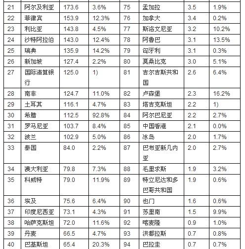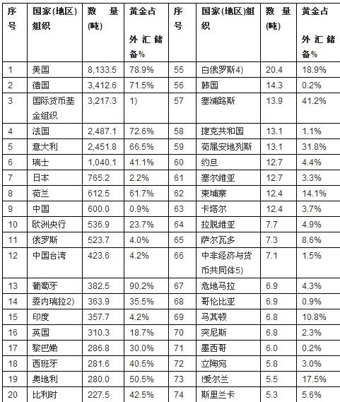 數(shù)據(jù)不是最新的,中國官方去年公布黃金儲備在1000噸左右。