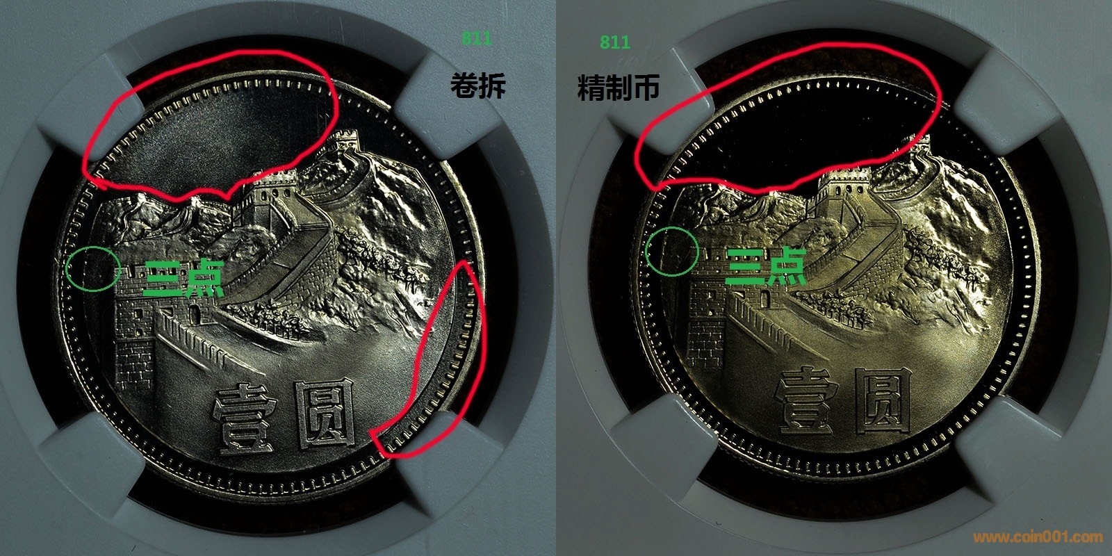 4、“三點”特征只有上海版1980/1981/1982/1983/1984長城幣五個年份的才有,且對應(yīng)年份的普制幣和精制幣都有,到上海版1985普制幣,就已經(jīng)沒有這個“三點”特征了,而是啟用了沒有“三點”凸起的新模具;