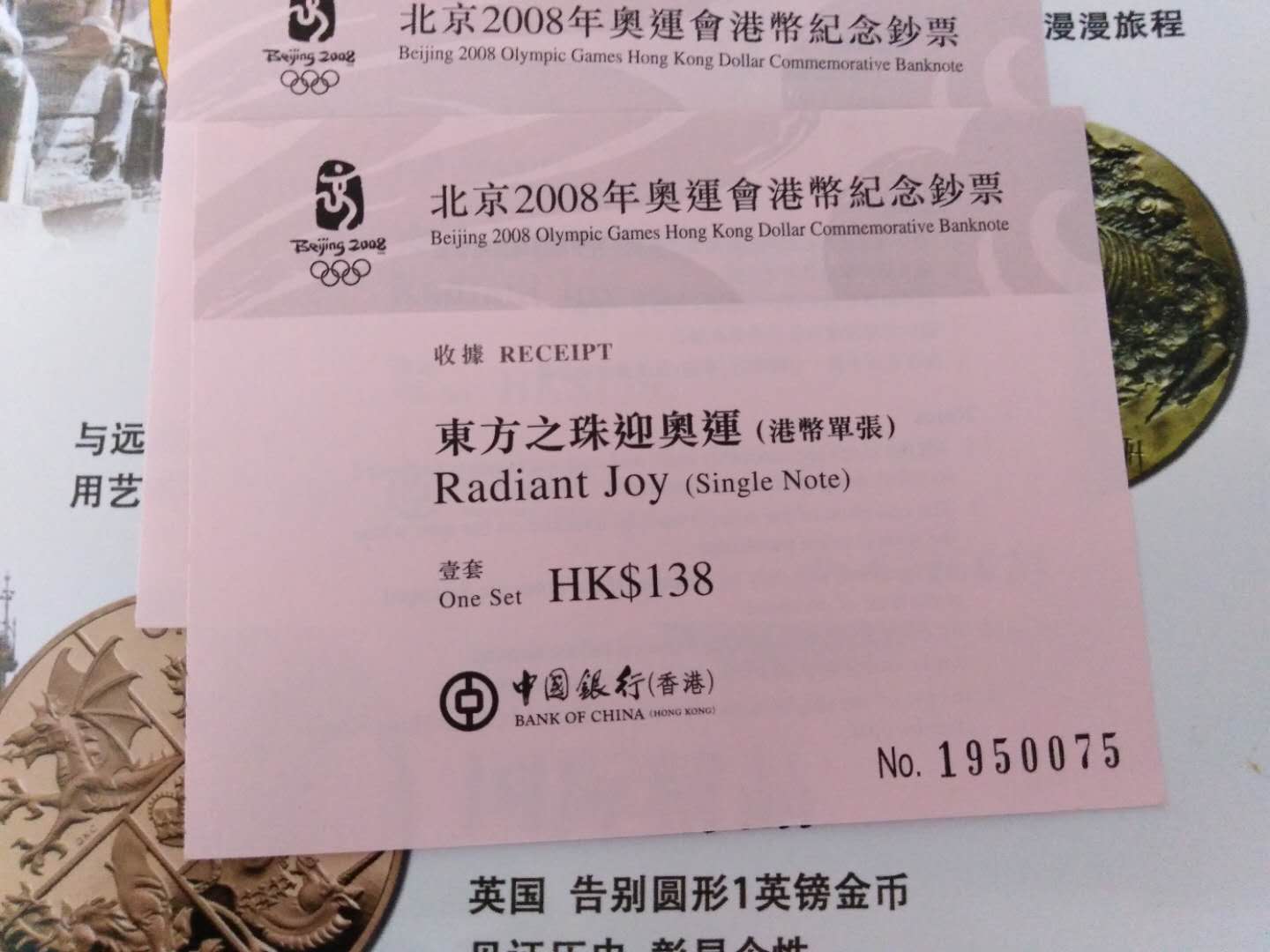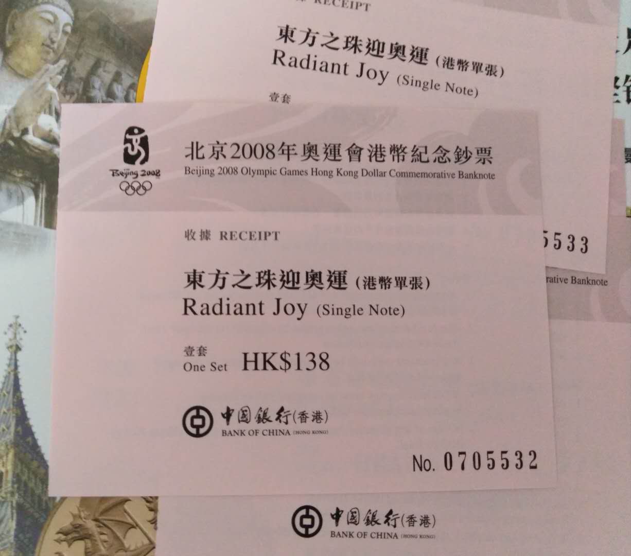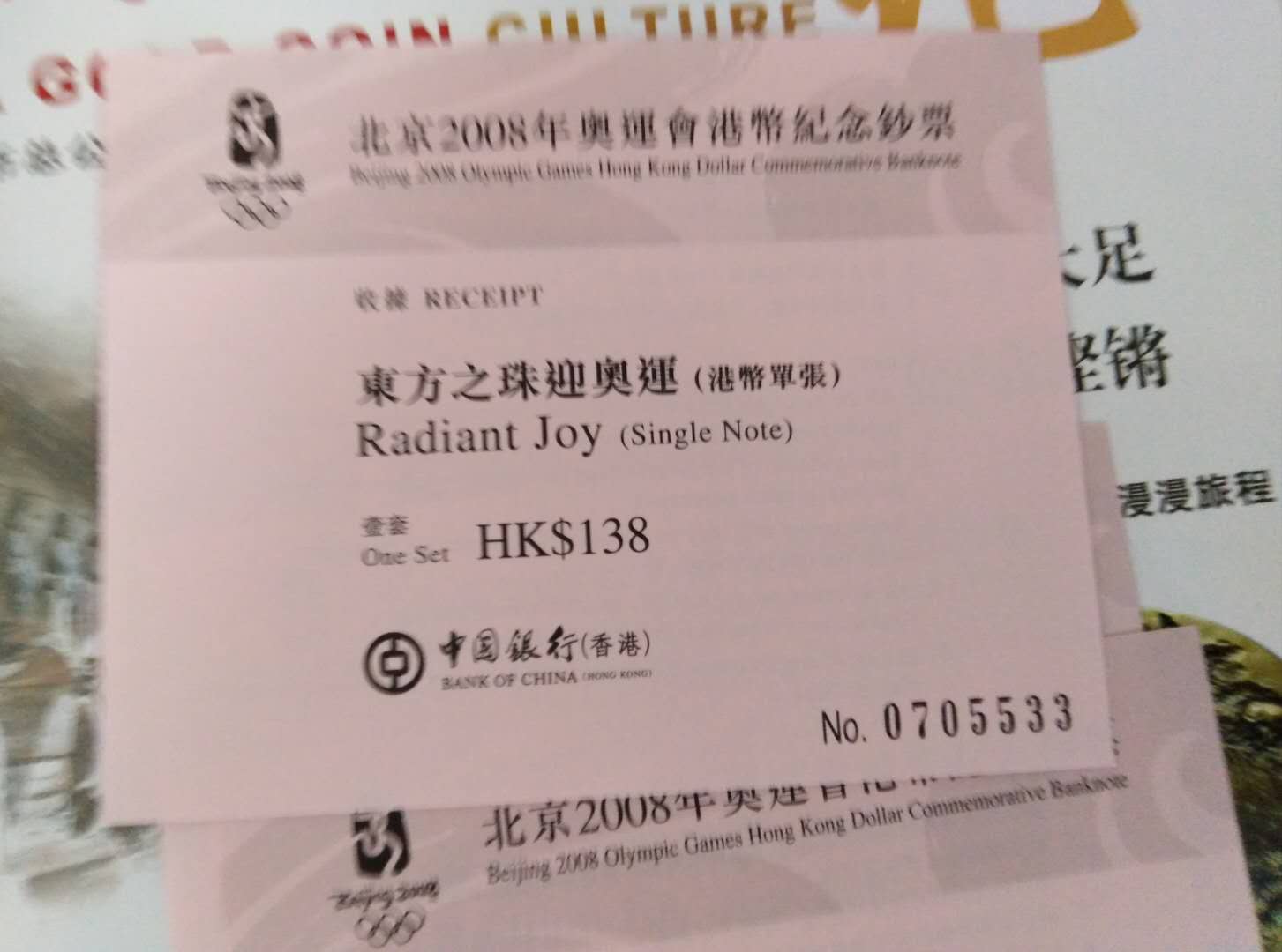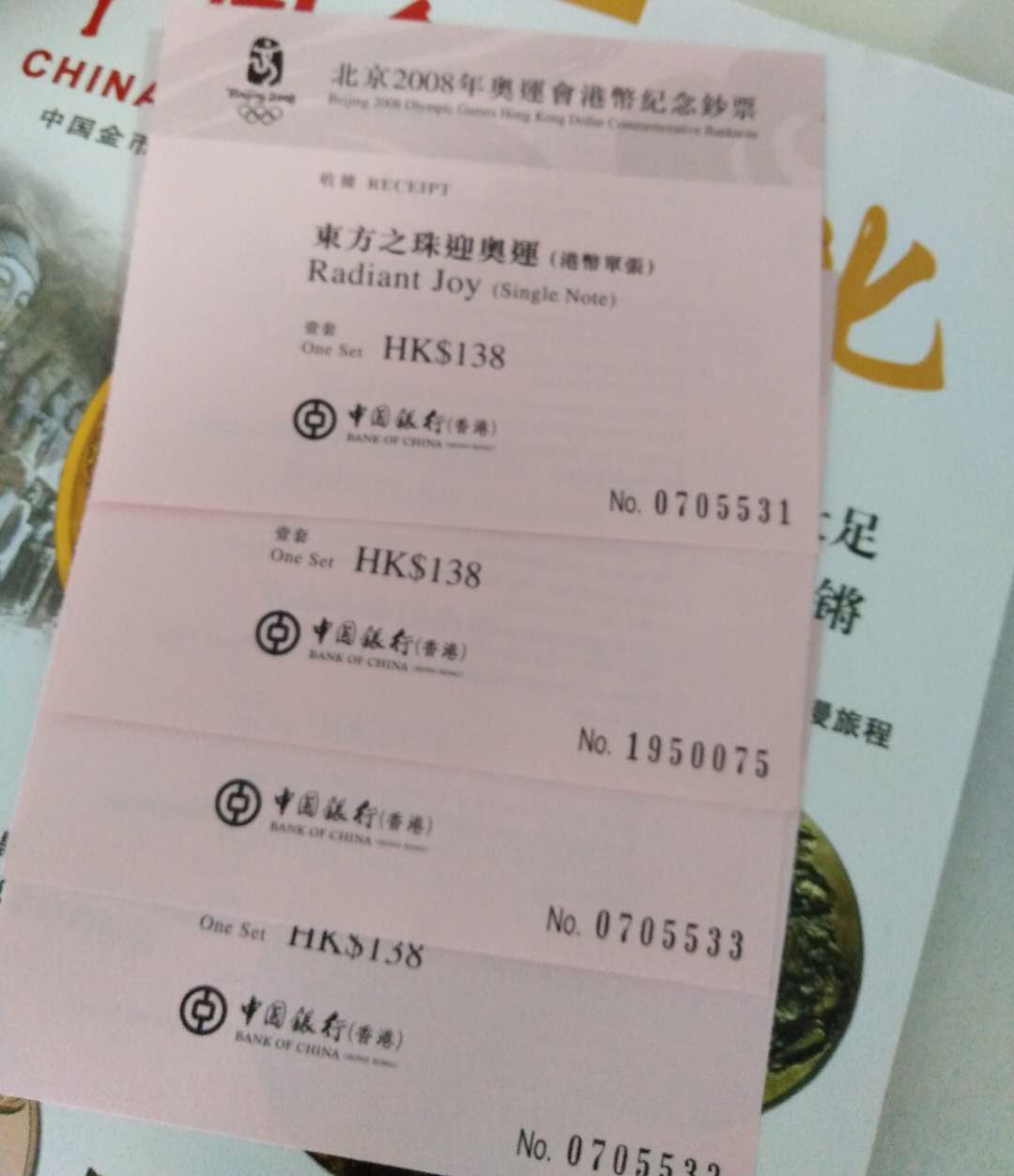 香港奧運(yùn)鈔收據(jù)4張無(wú)4
