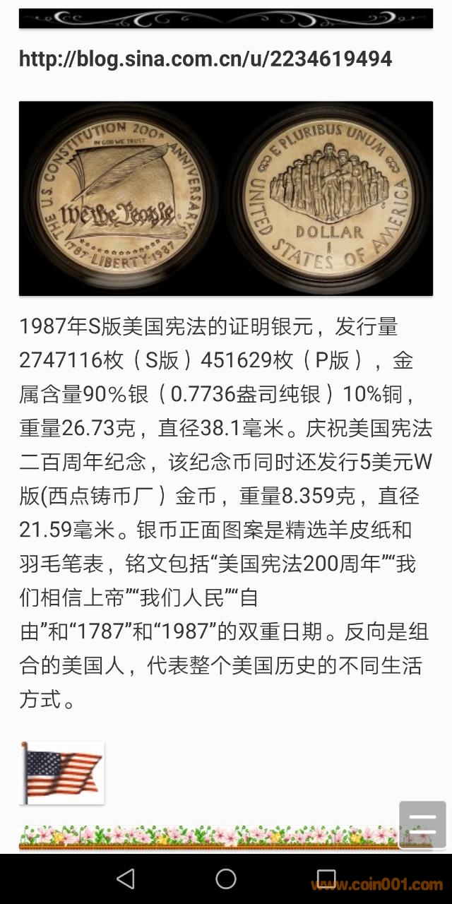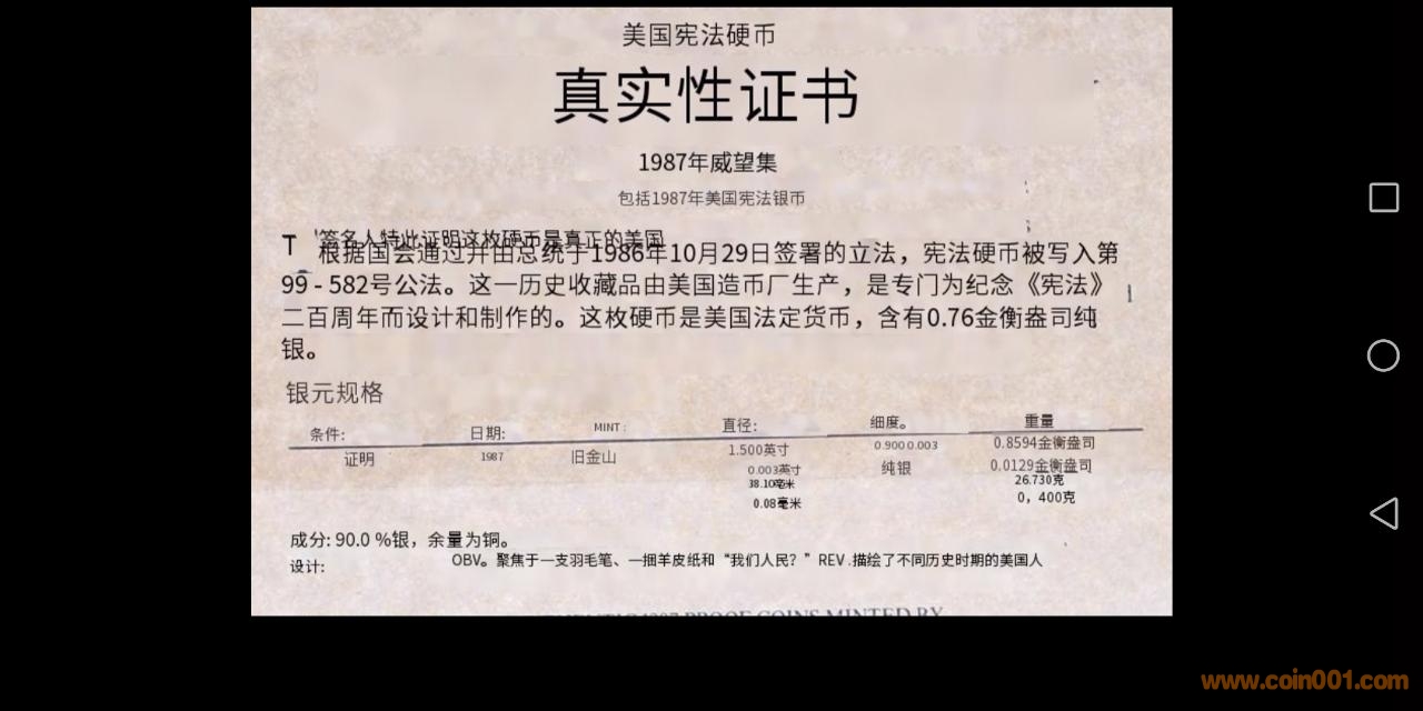 美國(guó)1987精制流通套幣和一個(gè)憲法銀幣套裝,配件齊全,品相好。后面有證書的中文翻譯圖片,軟件翻譯將就看看。
