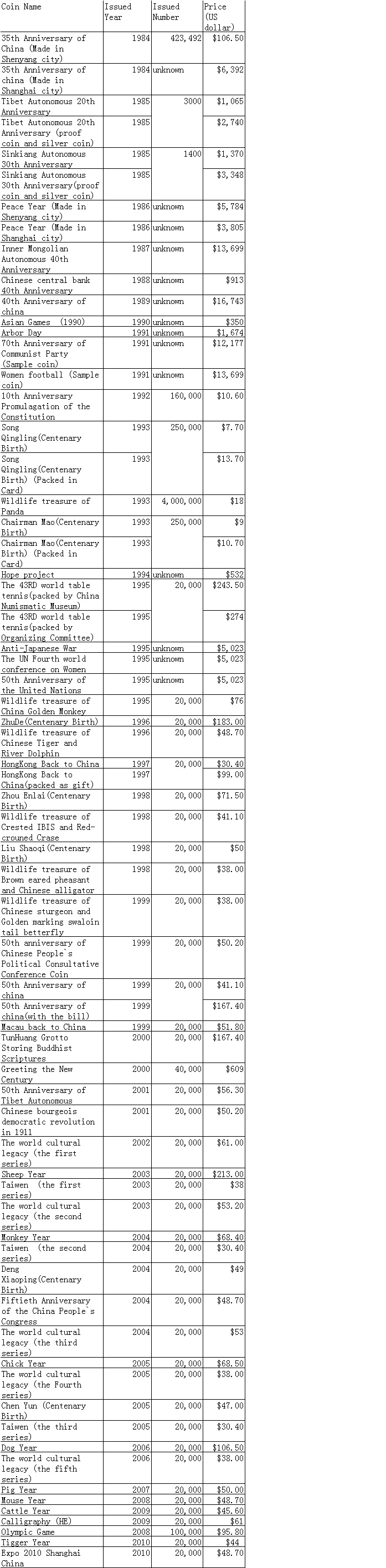 Chinese proof coins price lis ..