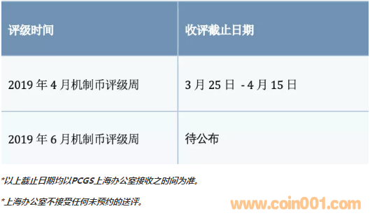 (中國(guó),上海)- PCGS上海辦公室2019年4月機(jī)制幣評(píng)級(jí)周活動(dòng)將于2019年3月25日展開(kāi),請(qǐng)各位PCGS收藏家俱樂(lè)部會(huì)員和授權(quán)經(jīng)銷商根據(jù)評(píng)級(jí)時(shí)間做出安排,預(yù)約送評(píng)!