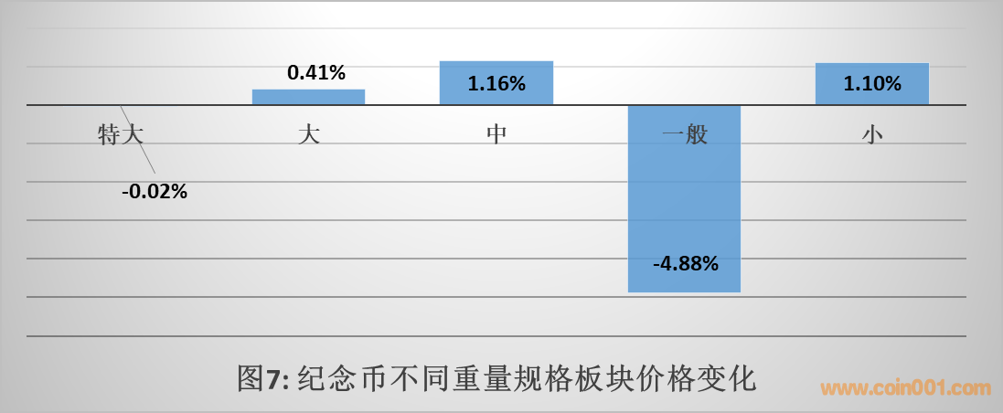 如圖6所示,在不同貴金屬材質(zhì)板塊中,僅有鈀幣錄得上漲,其它板塊均處于下跌狀態(tài),其中銀幣的下跌幅度最大,達(dá)到7.31%。
