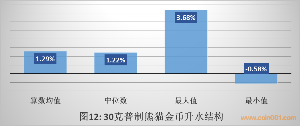 如圖12所示,在上半年96個有效交易日中,30克普制熊貓金幣的交易價格升水最高3.68%,最低-0.58%,算數(shù)均值1.29%,中位數(shù)1.22%。