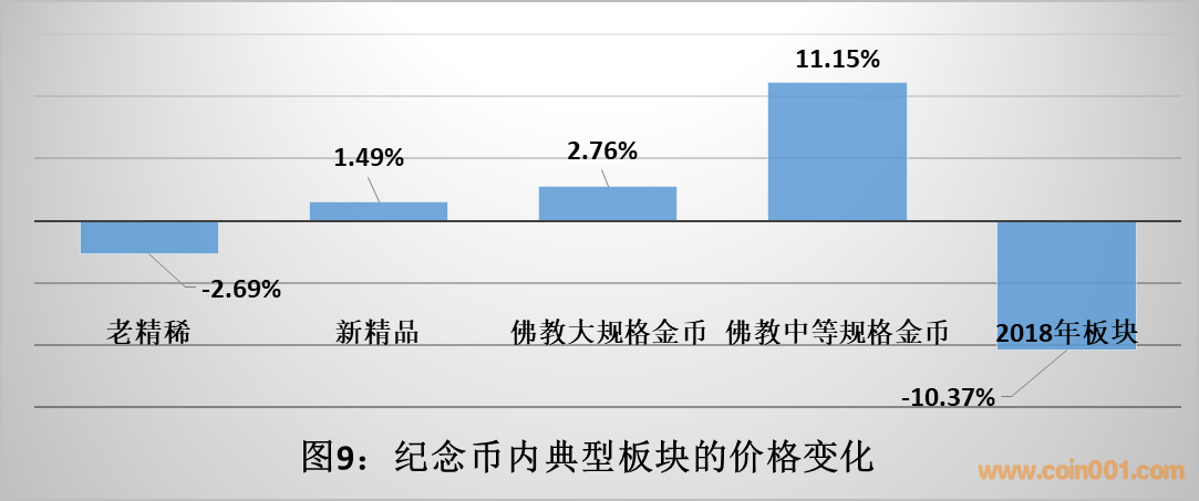 如圖9所示:①在金幣市場普遍關(guān)注的“老精稀”和“新精品”板塊中,“老精稀”板塊繼續(xù)處于下行態(tài)勢,“新精品”錄得小幅上漲。②關(guān)于近期社會普遍關(guān)注的佛教題材大中規(guī)格金幣的走勢,數(shù)據(jù)顯示這兩個板塊幣種的價格確有上漲,其中佛教5盎司金幣板塊整體錄得11.15%的漲幅。③特別值得關(guān)注的是2018年發(fā)行的紀(jì)念幣板塊,在新品高開低走的市場慣性作用下,2019年上半年整體繼續(xù)加速下行,錄得10.37%的大幅度下跌,出現(xiàn)整體跌破零售價的尷尬局面,成為2018年大盤紀(jì)念幣下跌的重災(zāi)區(qū)。