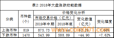 在2018年大盤市場價總值的變化中,漲跌幣種的總動能狀況見表2。