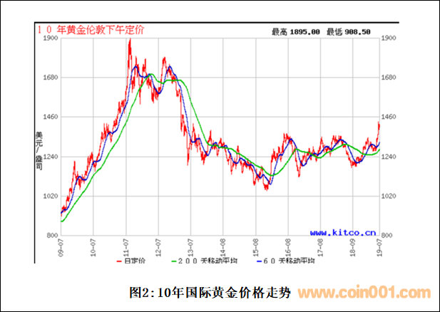 ?? 如圖2所示,隨著2011年8月國際黃金價格達(dá)到上一輪牛市周期的頂部后,國際金價開始步入下行周期。2016年至2018年黃金價格始終處于1061.79至1366.75(盎司/美元)的箱體震蕩區(qū)間。2019年6月黃金價格開始出現(xiàn)大幅上漲,最高錄得1438.75(盎司/美元),形成2016年以來的新高點。國際黃金價格箱體震蕩重心上移將是大概率事件。