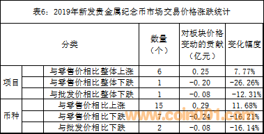 如表6所示:市場交易價格與零售價相比:①在2019年上半年新發(fā)的項目中有6個項目的市場價整體高于零售價,有1個項目整體低于零售價,它是“2019年中國北京世界園藝博覽會貴金屬紀(jì)念幣”項目,而且這個項目也整體跌破批發(fā)價。②在2019年上半年新發(fā)的22個幣種中有15個幣種的市場價高于零售價,有7個幣種跌破零售價,有2個幣種跌破批發(fā)價。