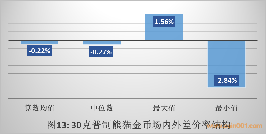 如圖13所示,在上半年96個有效交易日中,30克普制熊貓金幣的場內(nèi)外差價率最高1.56%,最低-2.84%,算數(shù)均值-0.22%,中位數(shù)-0.27%。