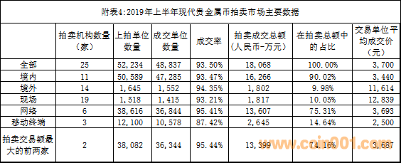 2019年上半年我國現(xiàn)代貴金屬幣的拍賣狀況統(tǒng)計見附表4。