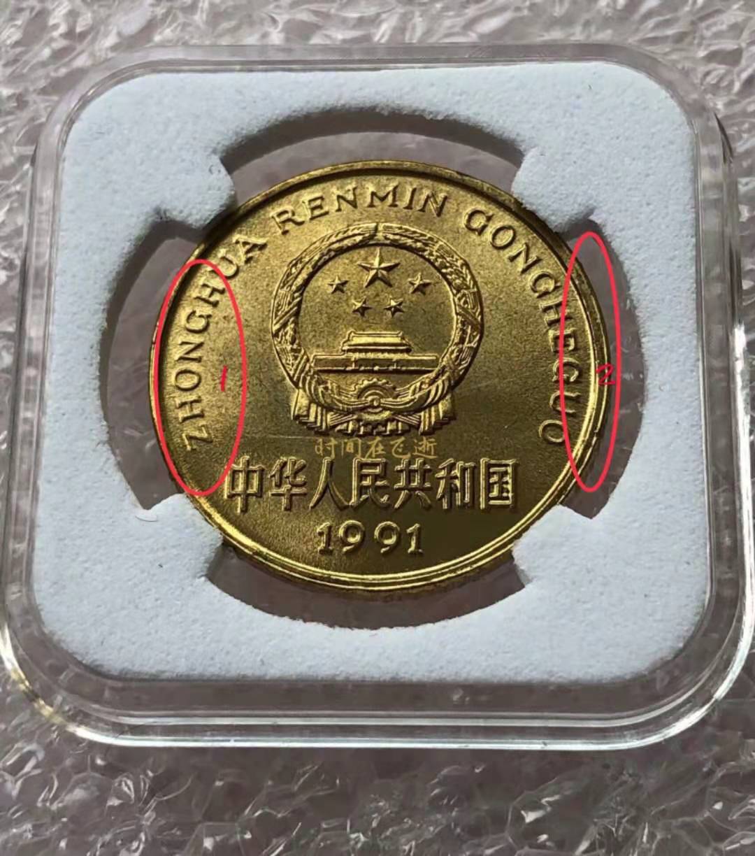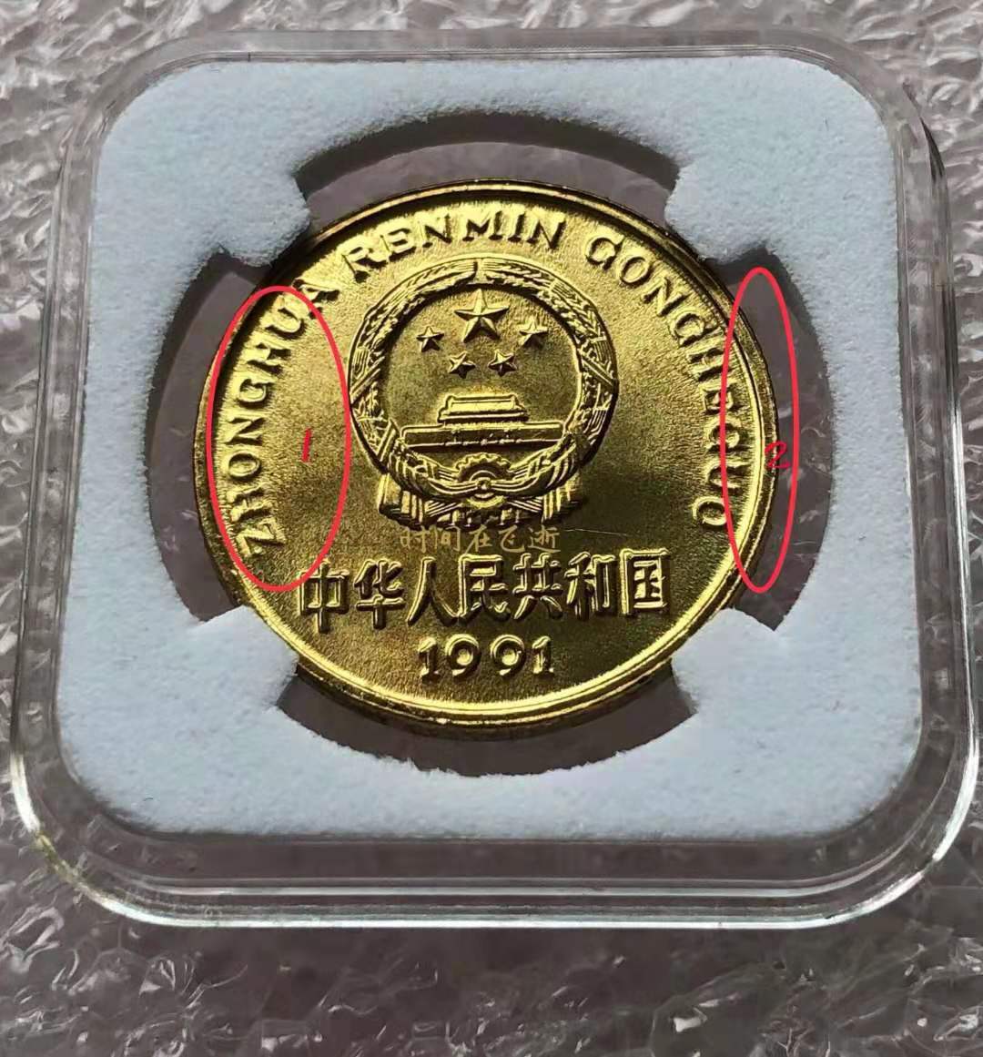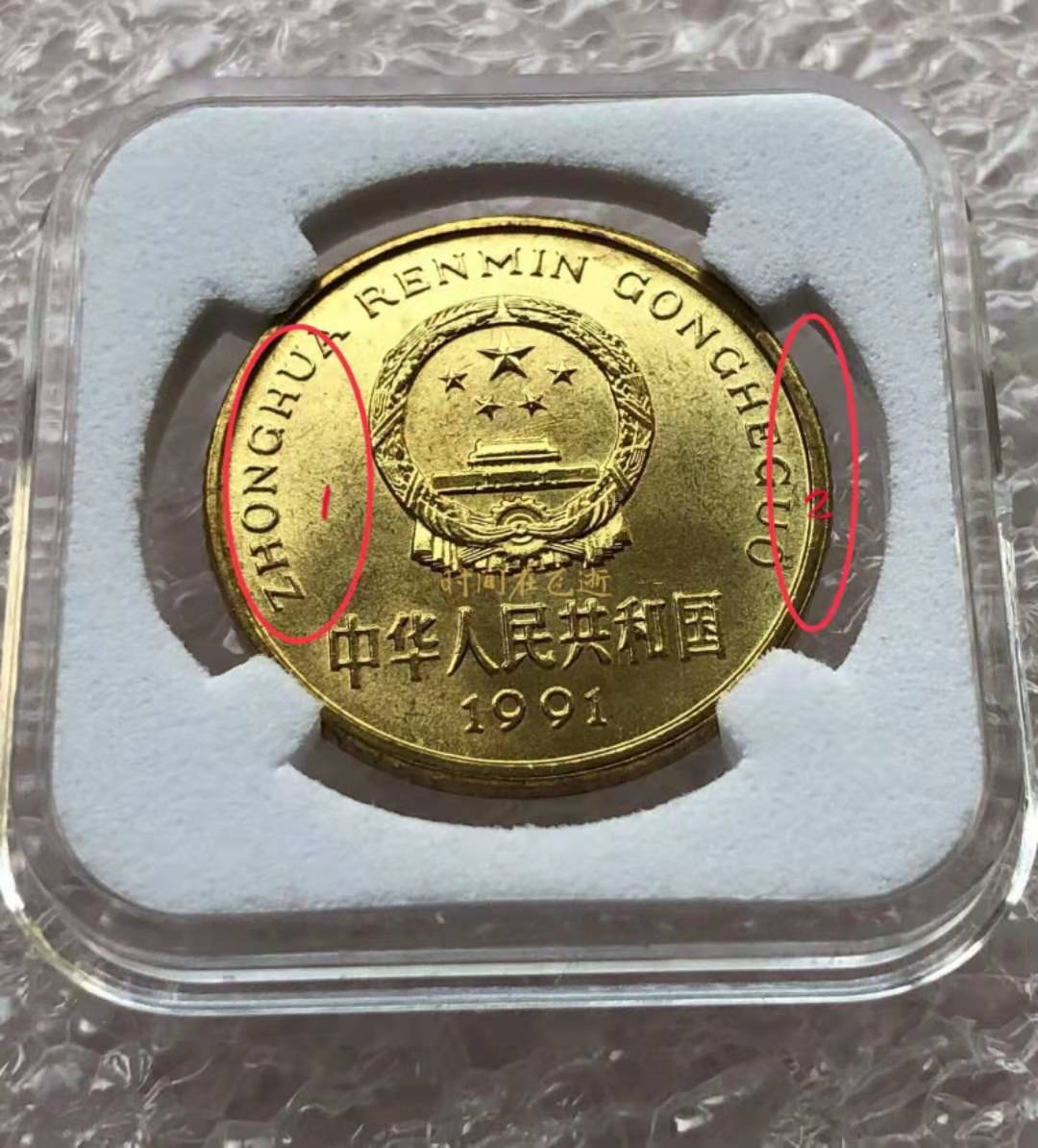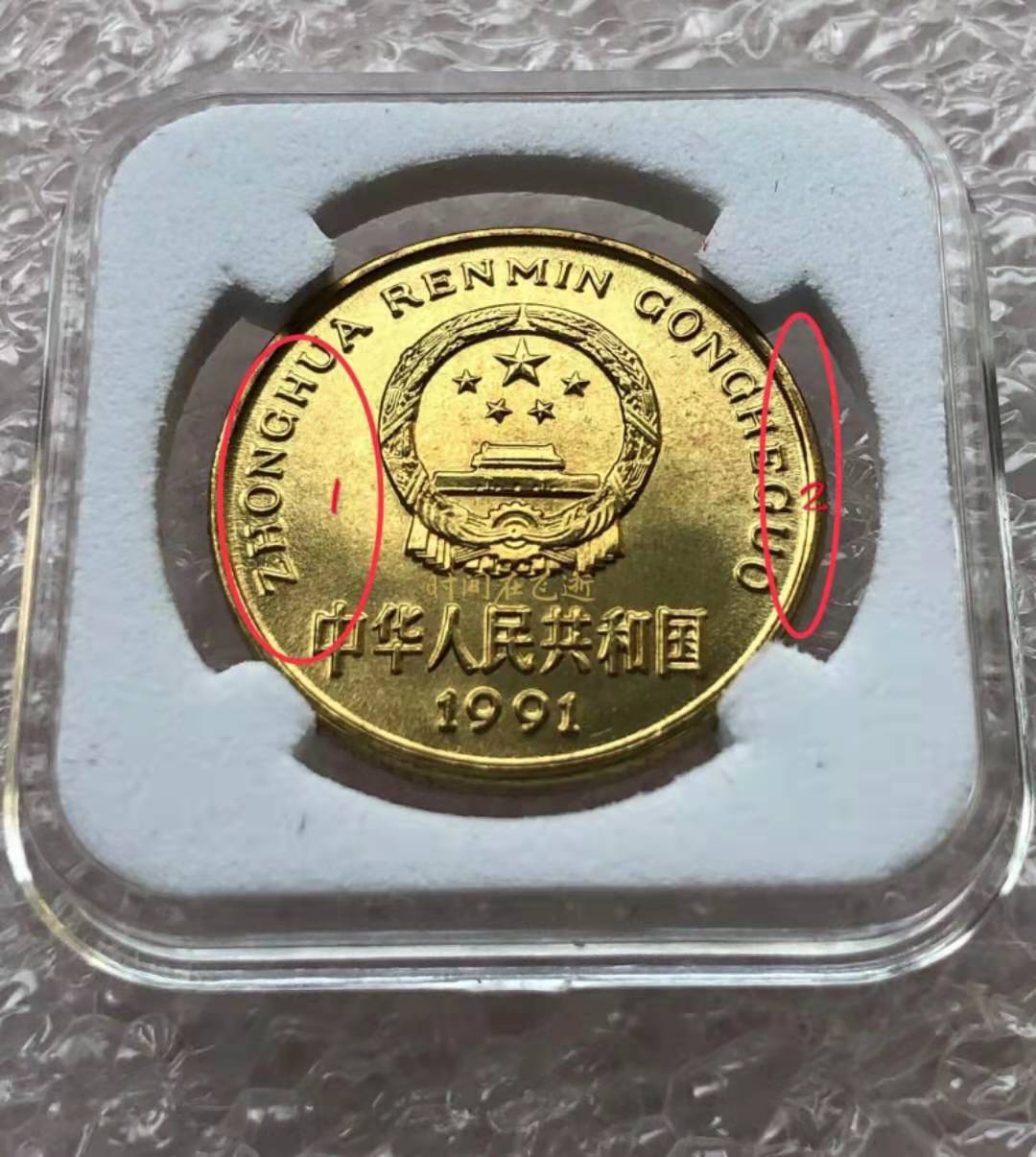 [backcolor=transparent](2)國徽面1代表:“拼音的粗細(xì)對比”。2代表:“幣邊緣的沖壓痕跡對比”