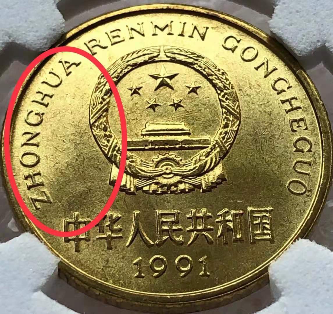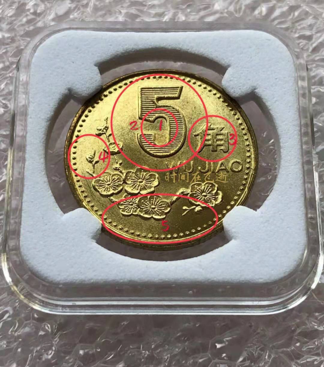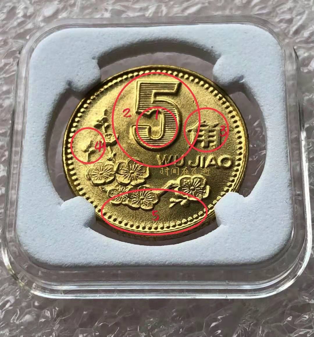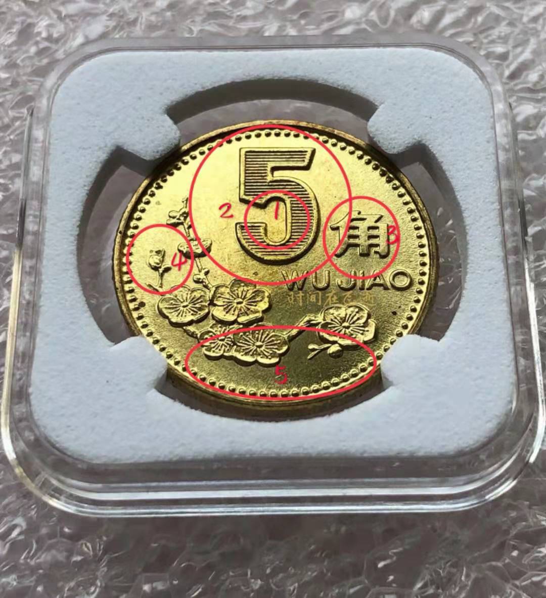 [backcolor=transparent](2)國徽面1代表:“拼音的粗細(xì)對比”。2代表:“幣邊緣的沖壓痕跡對比”