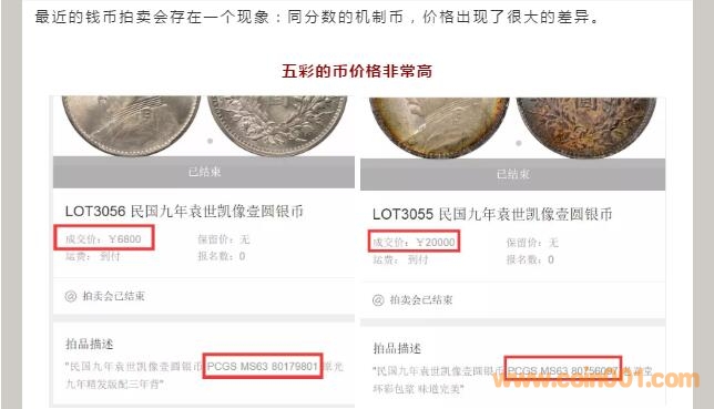 拍賣五彩包漿幣,價格勝過同分原光幣很多,只能說明有人很喜歡彩幣,并不能因?yàn)橛腥伺既粠状纬隽烁邇r買走就意味著彩幣就比原光幣要好了。那個拍了二萬多的袁大頭五彩銀元,品相是不咋地的,不但人物面有明顯的幾處痕跡,反背嘉禾面下部亦有一片不小的弱打存在,均觸目驚心。但玩物各有所愛,有人喜歡,愿意出高價買,那也是不足為奇的。
