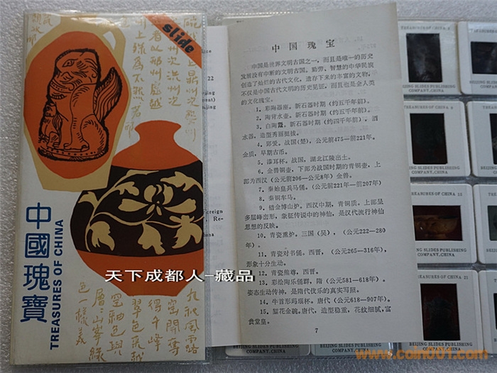 早期海外版、中國(guó)古代青銅器幻燈片:[font=arial;]中華人民共和國(guó)文化部外聯(lián)局監(jiān)制、中國(guó)北京幻燈制片廠制作發(fā)行《中國(guó)瑰寶彩色幻燈幻燈套片》原塑冊(cè)全套24張幻燈片配說(shuō)明書(shū);選用當(dāng)時(shí)電影膠卷專(zhuān)業(yè)攝影拍攝而成,各幻燈片尺寸(長(zhǎng)35*寬22毫米)、各卡片正背面分別刊“中國(guó)瑰寶、中國(guó)北京幻燈制片廠及各幻燈片編號(hào)”中英文字樣;原外塑冊(cè)內(nèi)分別展示“中國(guó)瑰寶”,隨附“中國(guó)瑰寶”中英字樣說(shuō)明書(shū)一張;各幻燈片清晰、莊重高雅、保持完好;具有較高鑒賞趣味紀(jì)念價(jià)值(品如實(shí)物圖):