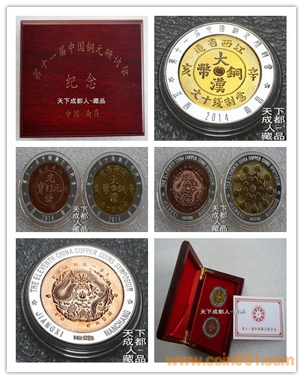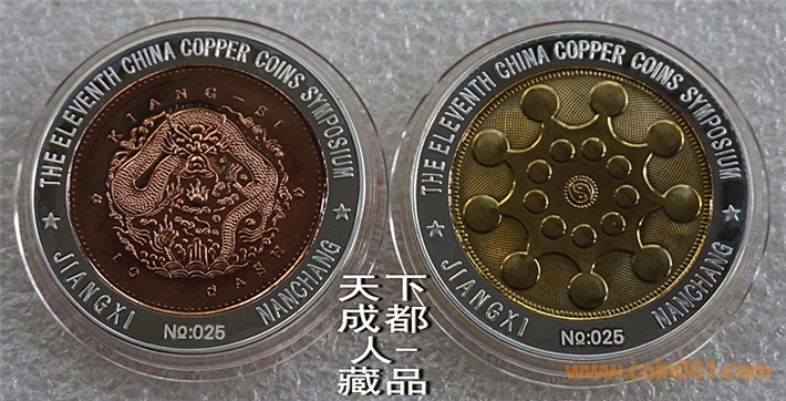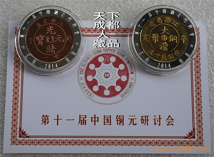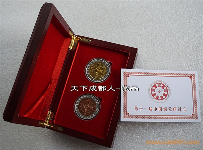 中國銅元系列紀念套章:[font=arial;]20114年9月19-21日第十一屆中國銅元研討會在江西南昌市隆重召開,組委會特設(shè)計制作發(fā)行《第十一屆中國銅元研討會(雙色精制)銀銅鑲嵌紀念套章》原盒證2枚/套裝;該紀念套章材質(zhì)分別為純銀和紅銅兩種(每枚外圈銀重量11.5克、成色99.9%,總重23克;內(nèi)圈分別為紅銅和紅銅鍍黃銅兩種材質(zhì)),套章直徑均36毫米,精制無齒邊現(xiàn)代幣形鑄造工藝,限量365套。原禮盒包裝,隨附無47編號證書1張,以資紀念。