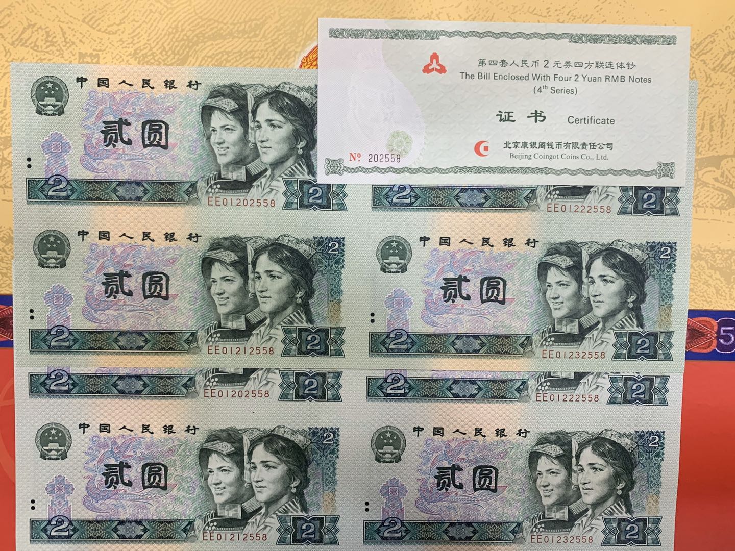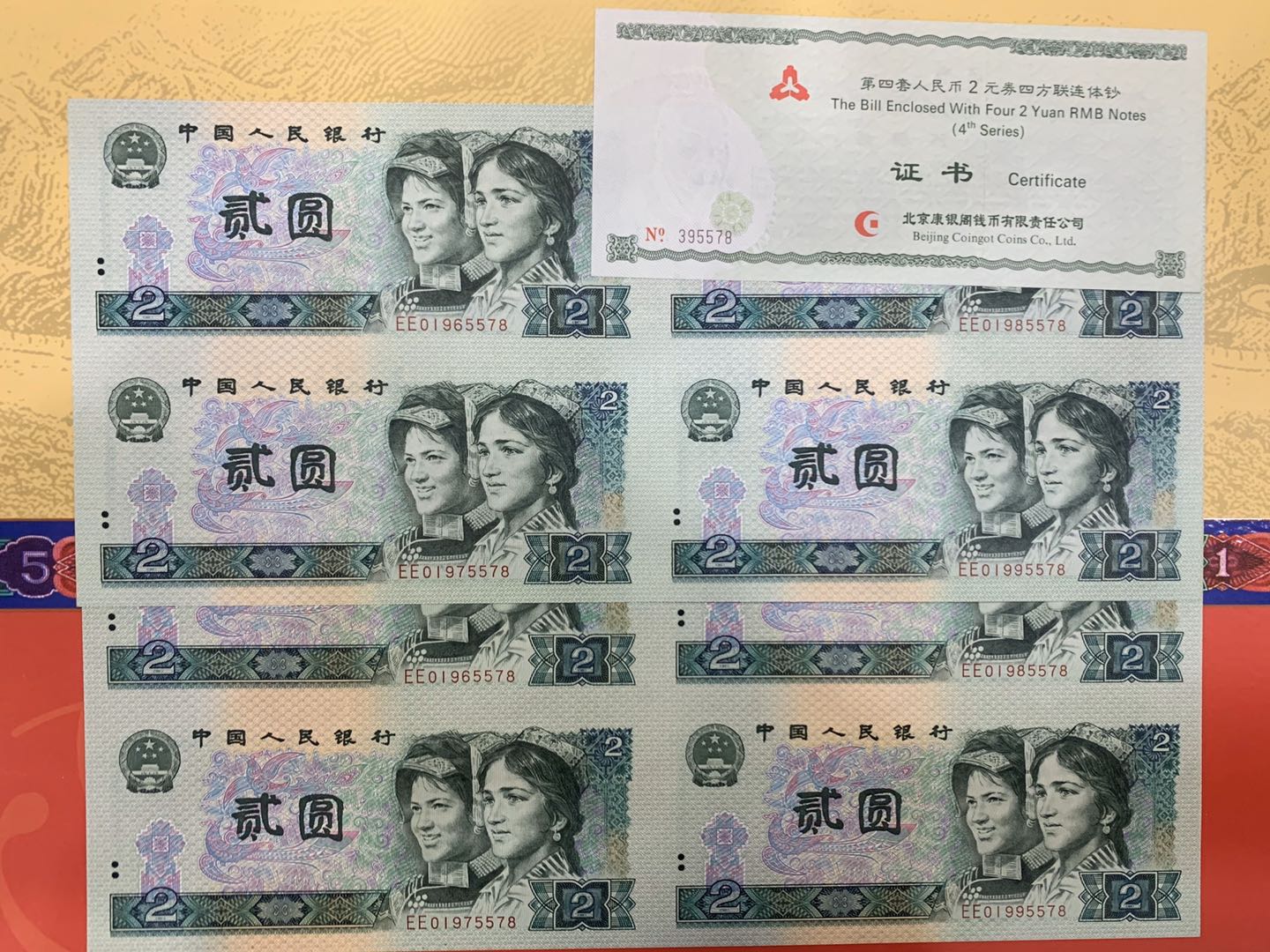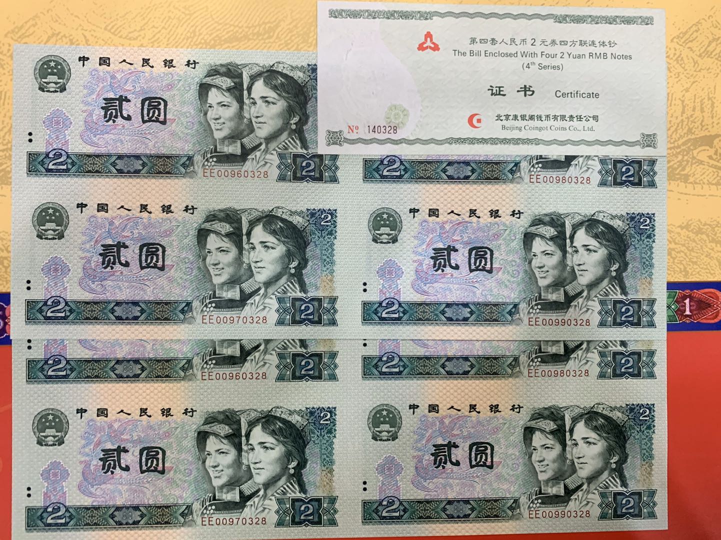 第四套人民幣2元四方連體鈔 8090年一套