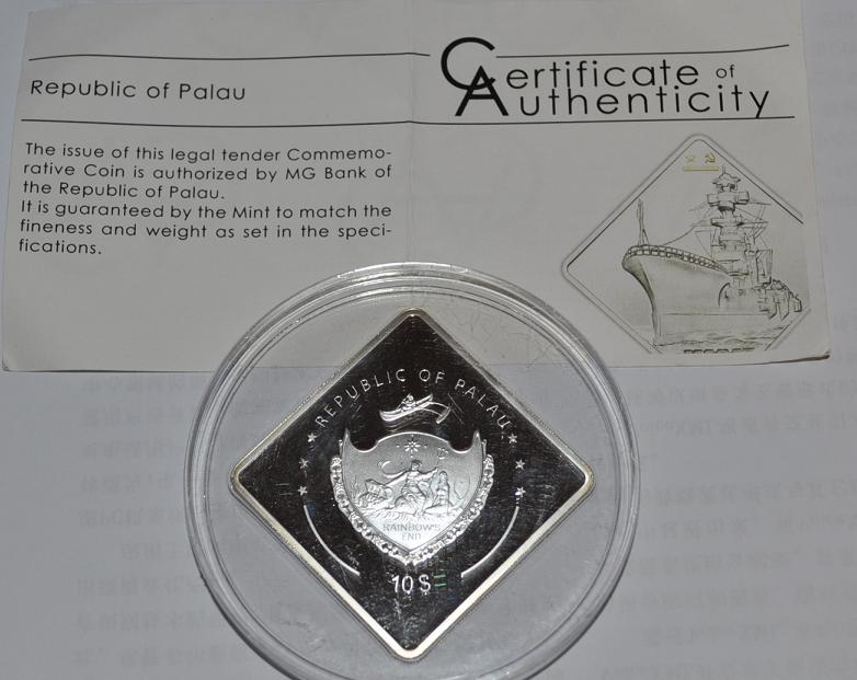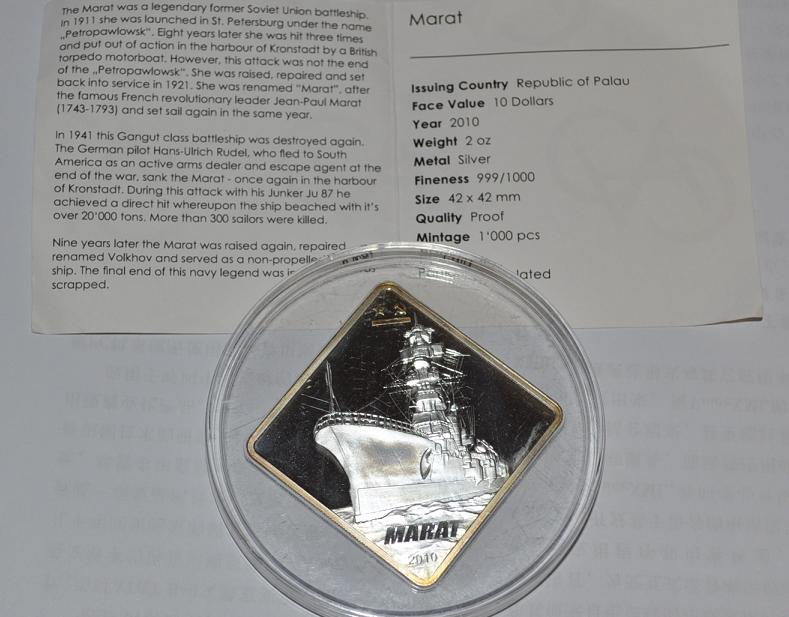 帕勞2010年二戰(zhàn)著名海軍戰(zhàn)艦系列蘇聯(lián)馬拉特戰(zhàn)列艦正方形精致鍍金紀(jì)念銀幣