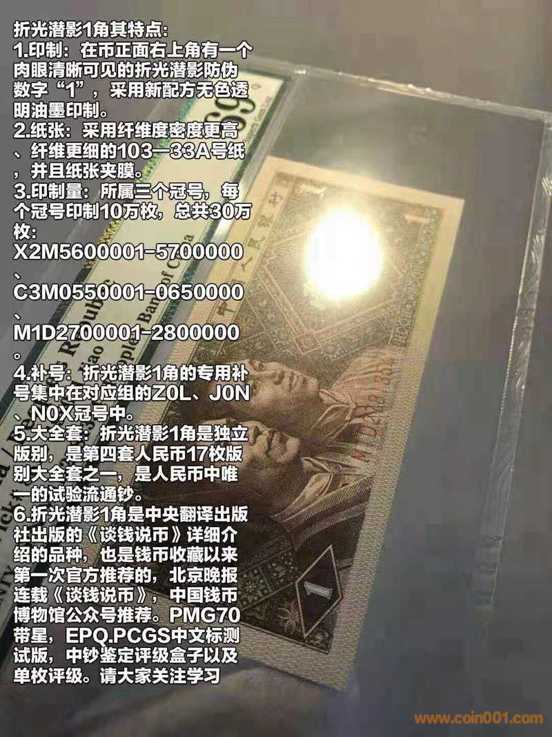 可見,由著名人物聯(lián)訣推薦的權(quán)威出版物《談錢說幣》一書,已把新發(fā)現(xiàn)的1980年版折光潛影1角,類同于背綠水印。無疑,此書已暗示了折光潛影1角'是第四套幣人民幣幣.王。由此不難看出,折光潛影1角未來價值成長空間極大。