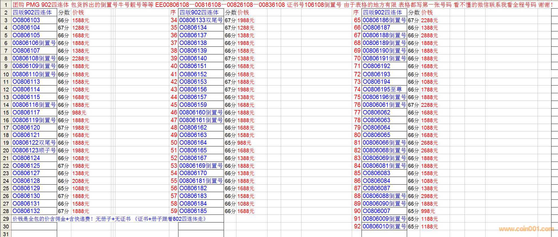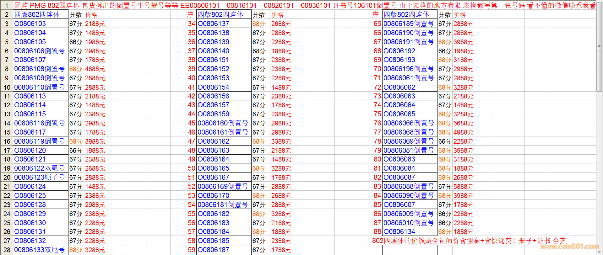 由于有一部分只要求配PMG 67分或者66分或者68分 只要求證鈔無47的同分即可,因為不可能配到張張都是全同號的, 也有一些買家又要求一對需要全同號的, 所以拆開出售,看表格挑選,不帶捆綁銷售。802有冊子+有證書 《902不帶冊子不帶證書》 一本起售 都包順豐快遞!如果挑選802+902同號一對的那么就有證書 有冊子 二張全同號 看2個表格 相互價錢一加 去尾數(shù) 付款就可以了 《比如802是2888元+902是1888元 二張一模一樣的號碼 要一對的就付款4700元就可以 省個快遞費當回饋》 謝謝!
