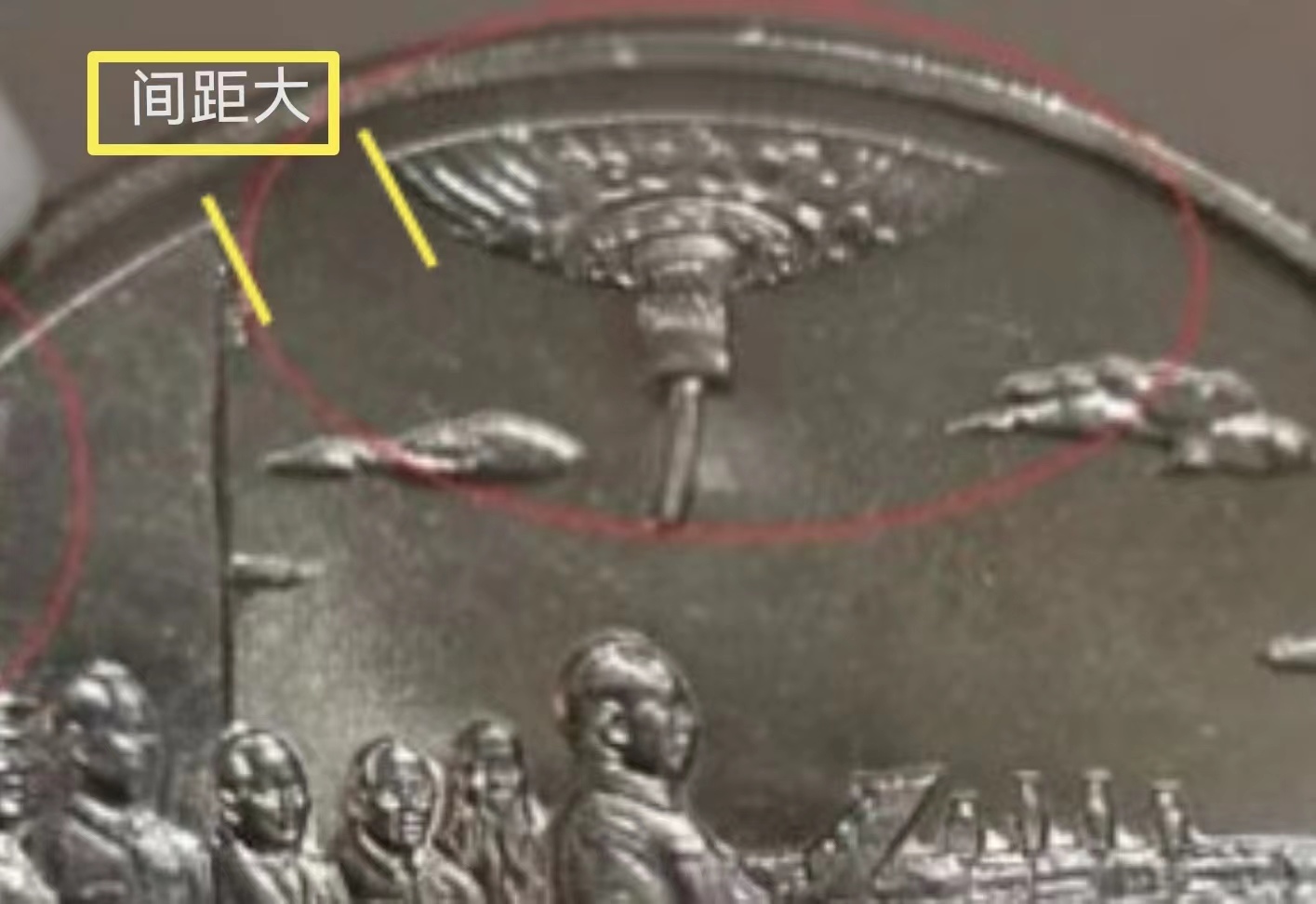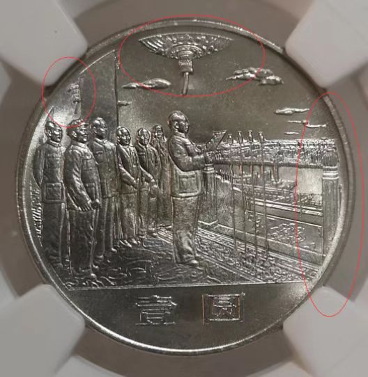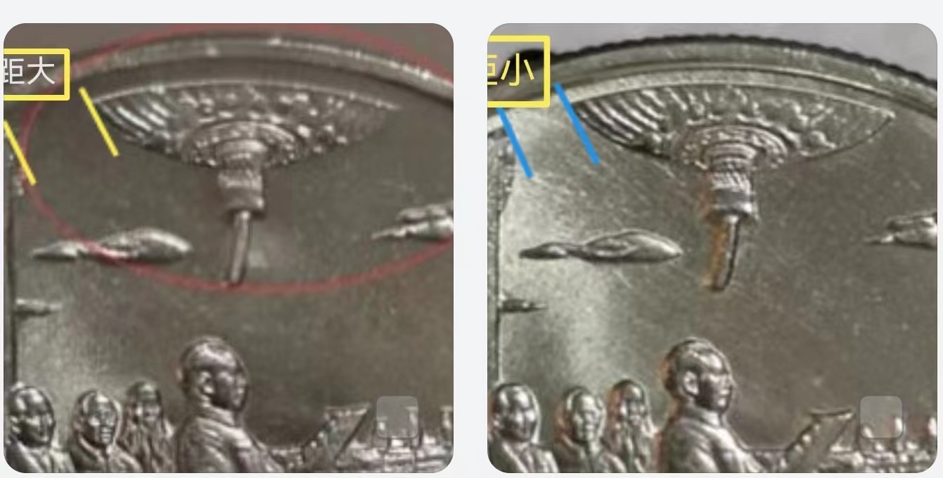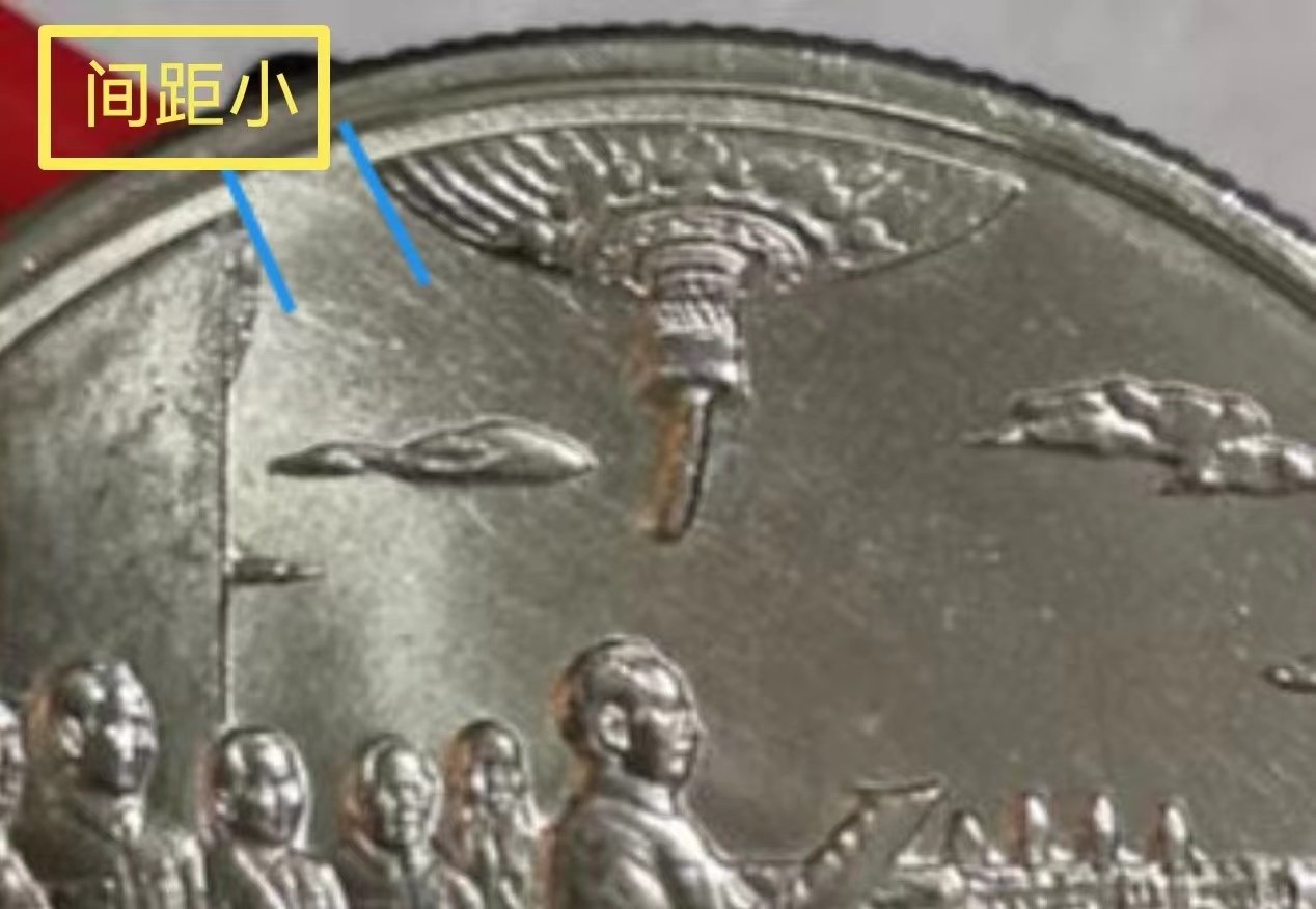 如果把錢幣擺成45度方向看,還是隱隱約約有條線狀,我與評級公司溝通,他們提供的高清照片是能看出線的,但不太完整了,是斷斷續(xù)續(xù)的,所以與“桿子沒了,電線還在”那種在性質上是一樣的,也可以叫話筒細線或話筒細桿。但總的情況,是話筒的桿子缺失并與另外三支話筒桿子形成明顯的異樣,我覺得愛藏評級最后仍然采用我最早的“話筒斷桿”,是恰如其分的,可以涵蓋其中若干種的小狀況。包括愛藏最先推出的1985年老西藏“雙柱版”,其實這個雙柱也是漸次由粗變細的,最細的需要使用放大鏡,是可見非常細微的雙柱的。