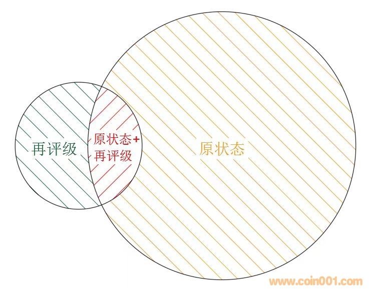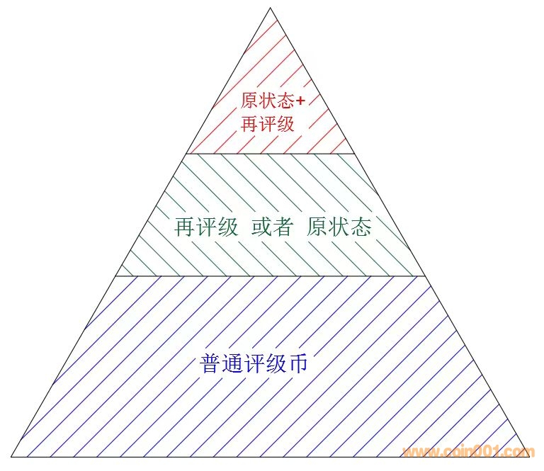 隨著時(shí)間的推移,我們的收藏理念與方式也有著的不斷的升華,新鮮事物的出現(xiàn)總要有一定的被接納的時(shí)間,就好像們接納評級幣一樣,現(xiàn)在有誰還會再討論錢幣是否應(yīng)該被評級的問題呢?很多現(xiàn)在看似再正常不過的東西,確實(shí)經(jīng)歷了很長時(shí)間的考驗(yàn)才被廣大藏家接受和認(rèn)可的。對于NGC原狀態(tài)評級標(biāo),我認(rèn)為會成為以后收藏的主流,會成為“小精品”錢幣的匯集地,會成為投資收藏的硬通貨。我結(jié)合原狀態(tài)評級和再評級,列出了我認(rèn)為的收藏“金字塔”體系,見圖5。金字塔最頂端的會是NGC原狀態(tài)標(biāo)再貼上再評級標(biāo)的評級幣;在中間位子的是僅僅是貼再評級標(biāo)的或是僅僅有原狀態(tài)評級標(biāo)的;金字塔最低端的就是普通的評級幣了。這個(gè)金字塔體系會直接影響藏品的收藏投資屬性,比如價(jià)格、出手的便利程度等。那么如何選擇哪些幣作為投資收藏的上品呢?我們再來看一下處于金字塔上兩層幣的數(shù)量,見圖6 。NGC原狀態(tài)標(biāo)再貼上再評級標(biāo)的數(shù)量一定是最少的;然后是再評級的數(shù)量;而NGC原狀態(tài)標(biāo)的數(shù)量一定是在前兩個(gè)層級中數(shù)量最多,選擇范圍最廣也是投資成本相對比較低的。因此,NGC原狀態(tài)標(biāo)評級幣,對于大多數(shù)藏家來說是相對比較容易購買到的,并且很有升值潛力的品種,現(xiàn)在市場價(jià)格才剛剛處于發(fā)展階段,仍有很大的潛力空間,以后很有可能成為新手入門以及投資收藏的首選。它既解決了原封、原冊幣章交易困難的問題,又解決了大家擔(dān)心評級幣洗幣、養(yǎng)護(hù)的問題,可謂是“魚和熊掌,皆可兼得”。