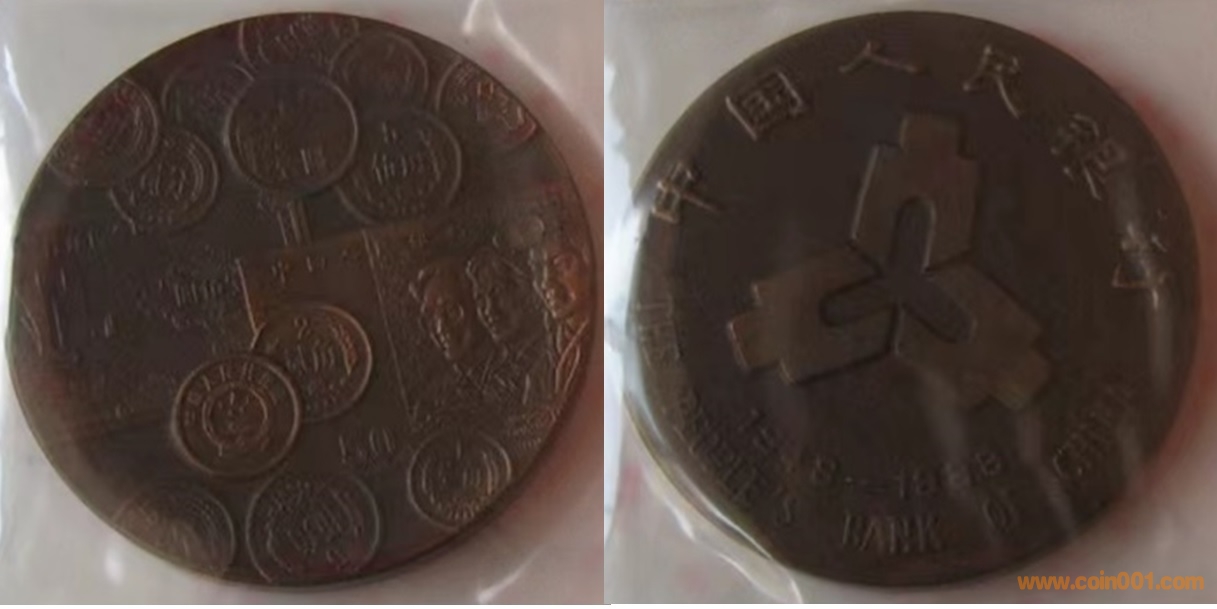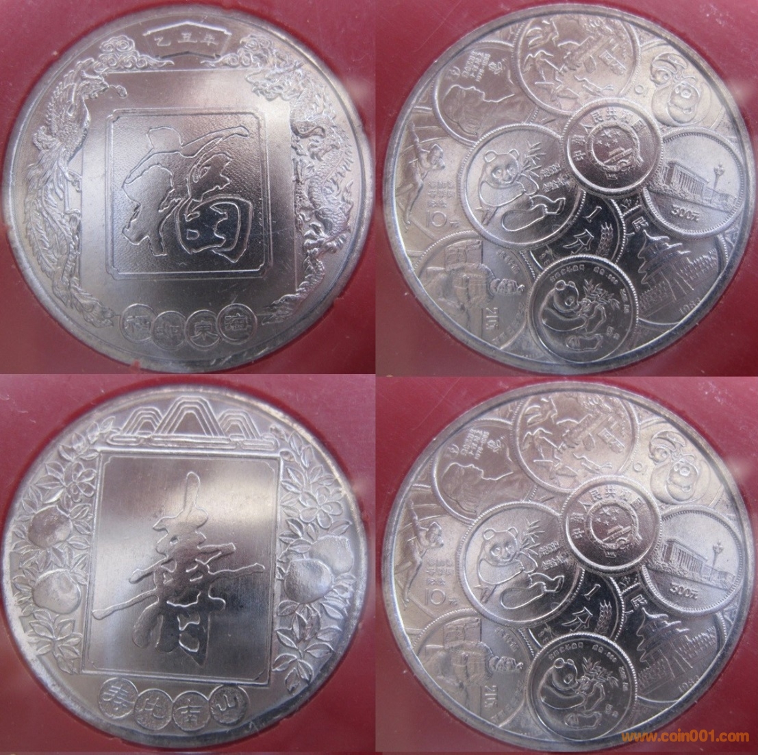 1985年制造,白銅普制,30mm,正面為福壽字,反面為熊貓、金銀幣、分幣等疊幣圖。