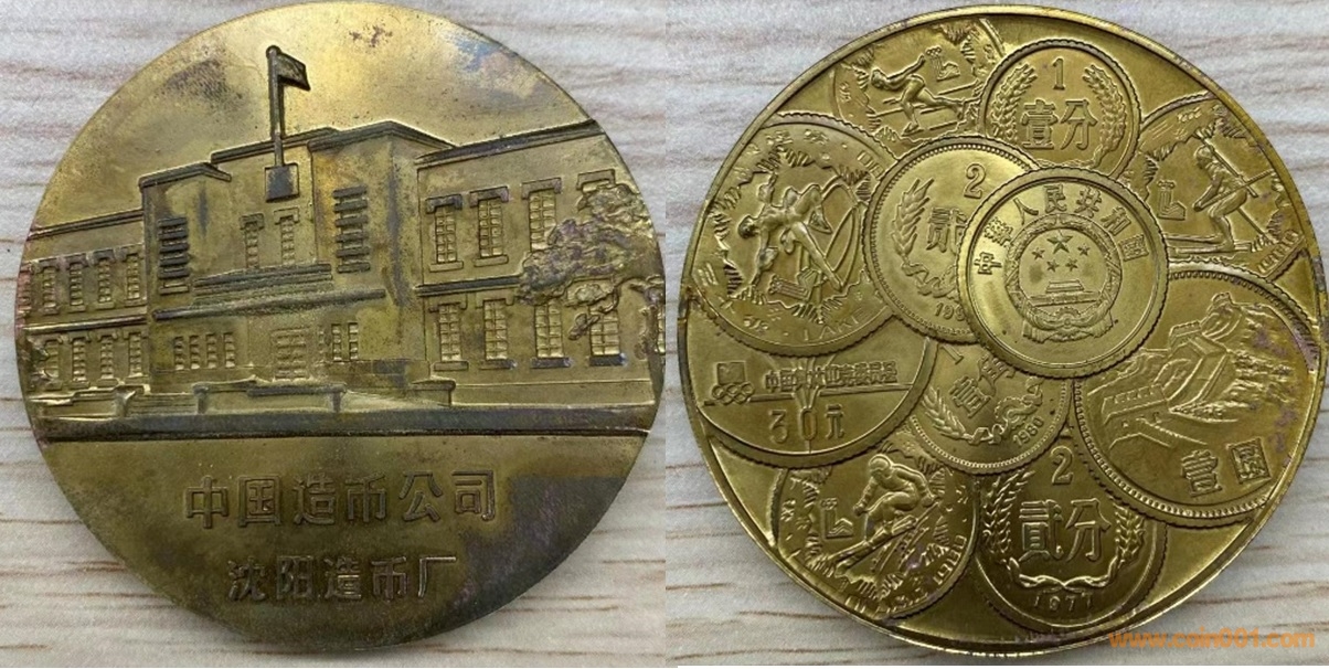 1985年制造,黃銅精制,40mm,沈幣發(fā)行。正面為沈幣廠房,反面為疊幣圖案。此章疑似有鍍金章仿品。